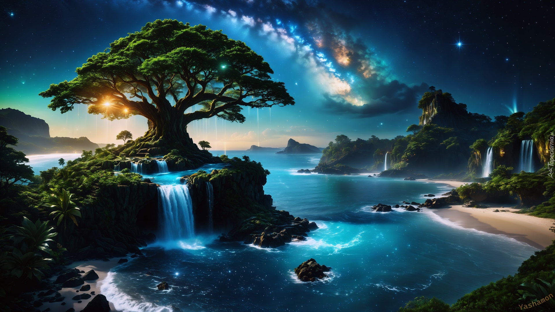Edytor tapety: Droga Mleczna nad drzewem i wodospadami nad morzem