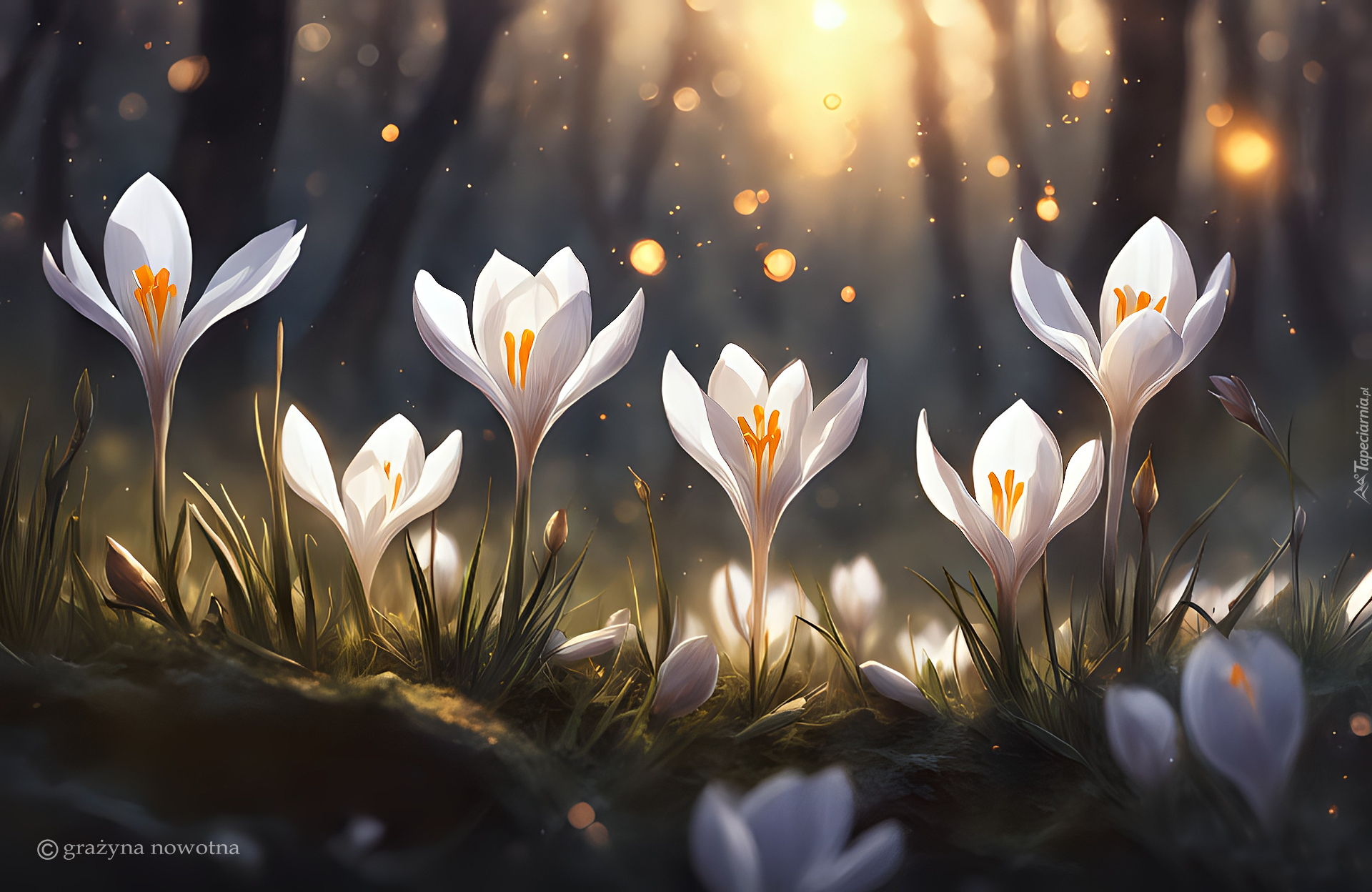 Edytor tapety: Rozświetlone białe krokusy na tle drzew