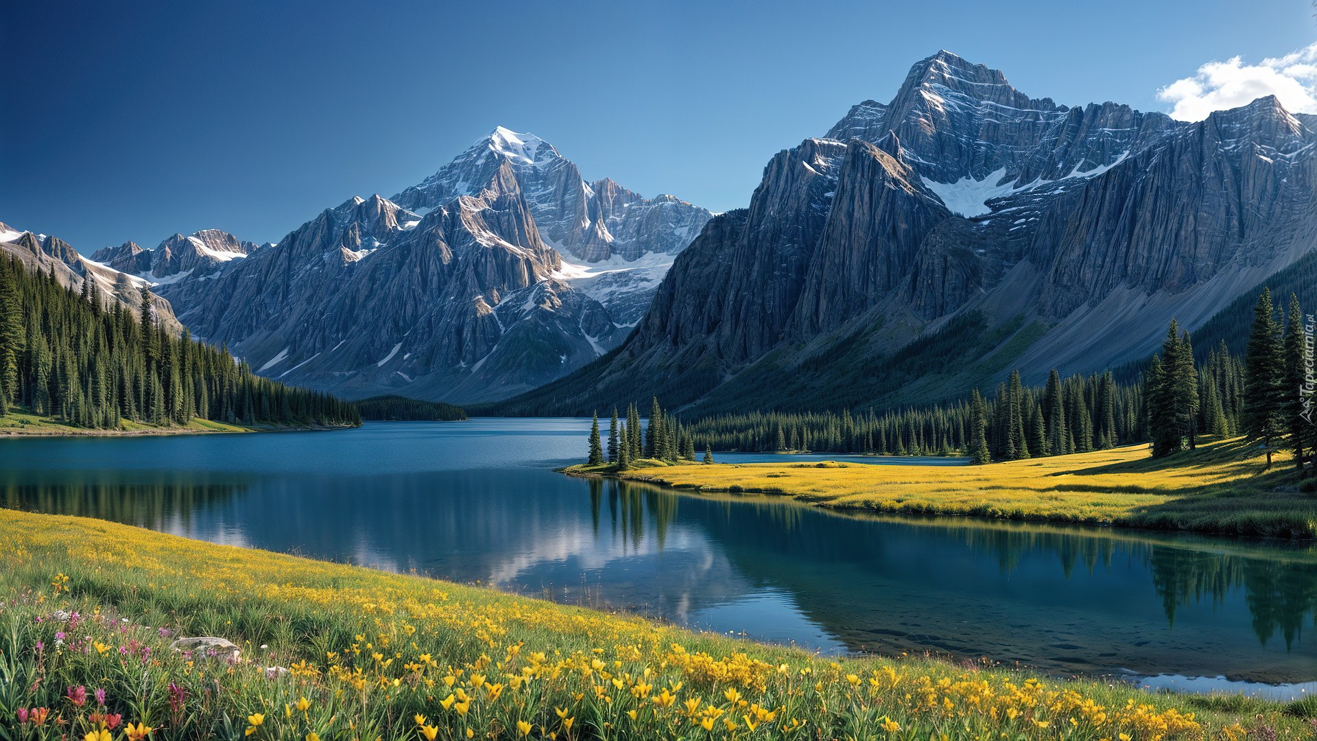 Edytor tapety: Żółte kwiaty na łące nad jeziorem w górach