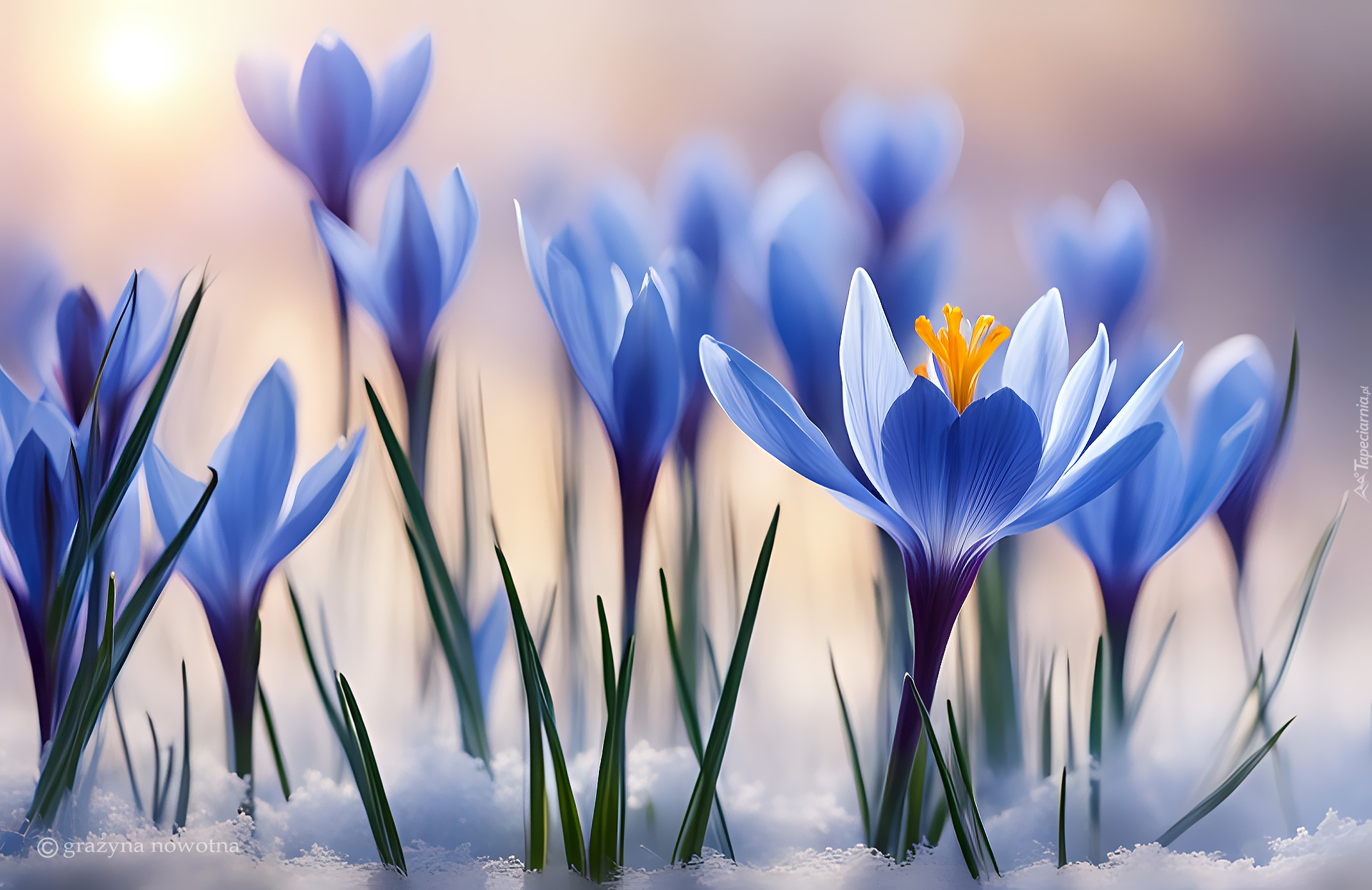 Edytor tapety: Rozkwitające niebieskie krokusy w śniegu