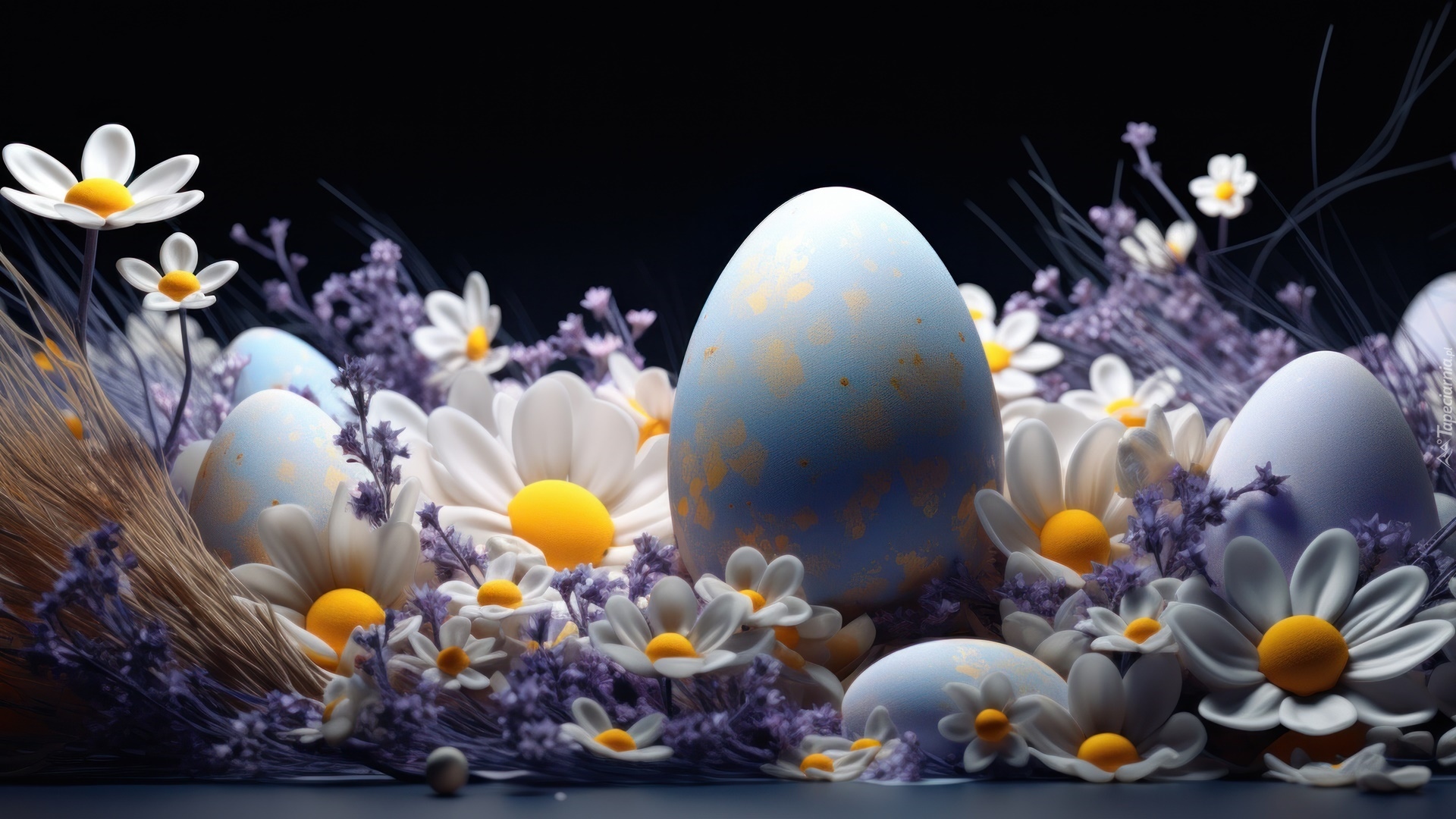 Edytor tapety: Pisanki na fioletowych i białych kwiatach