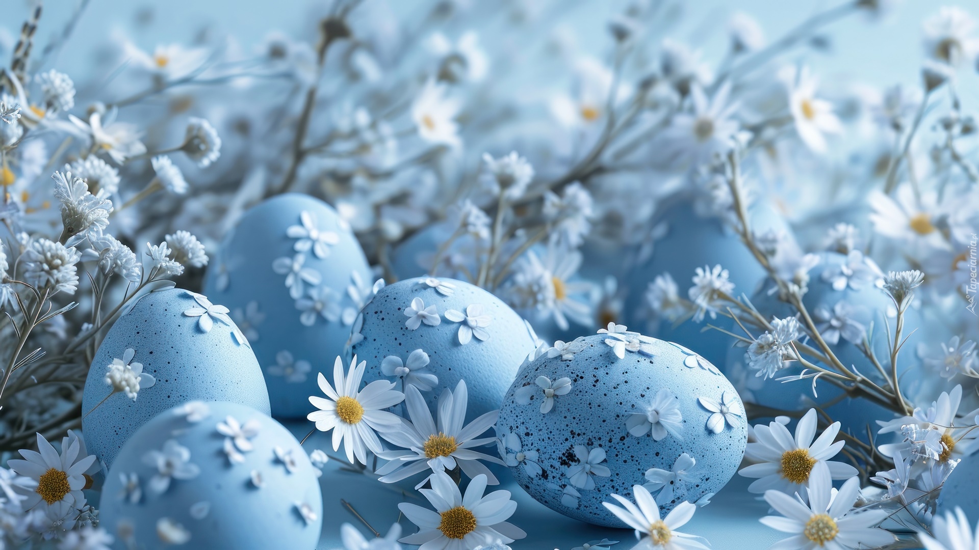 Edytor tapety: Niebieskie pisanki i białe kwiaty