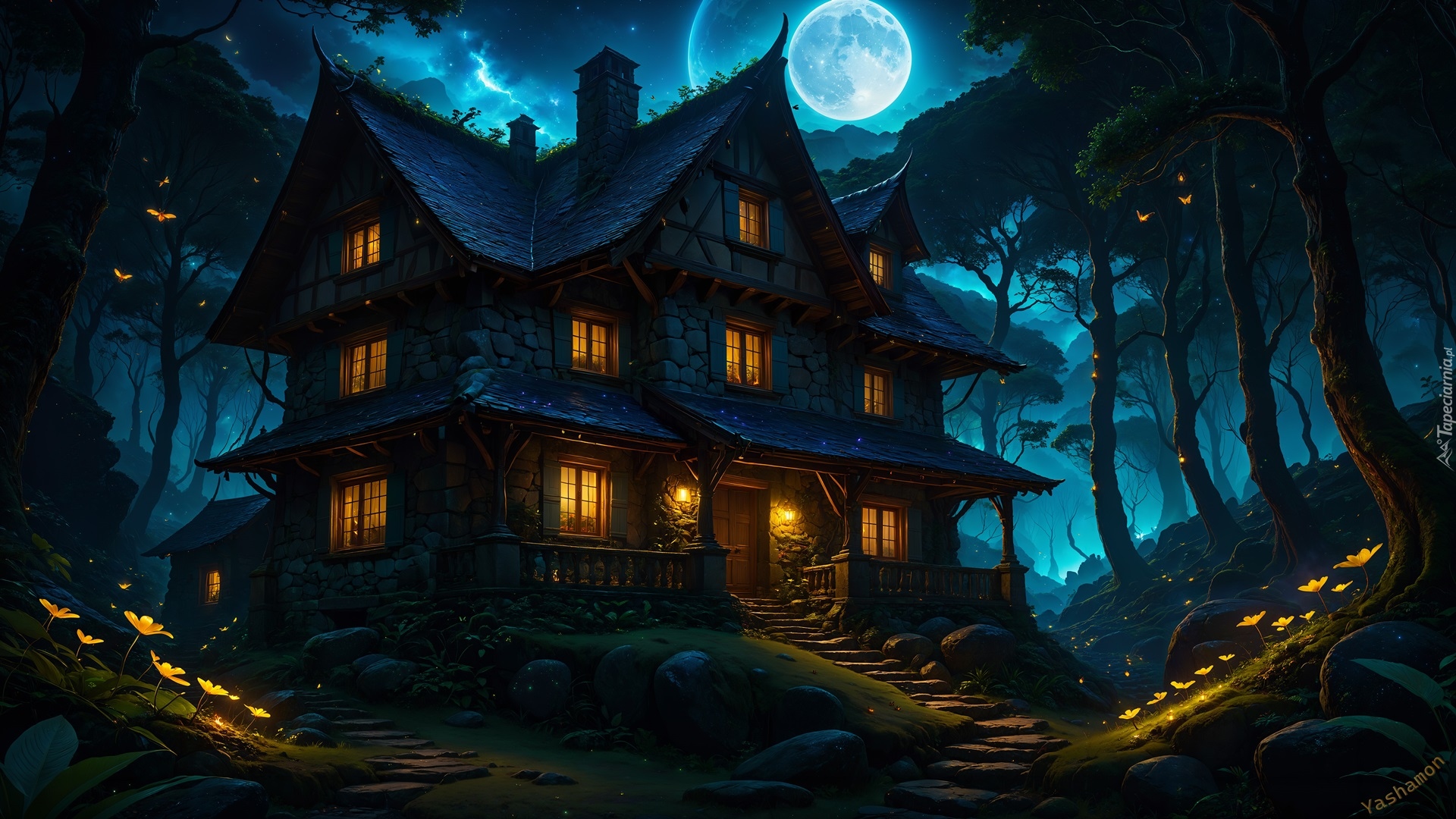Edytor tapety: Księżyc nad oświetlonym domem w lesie