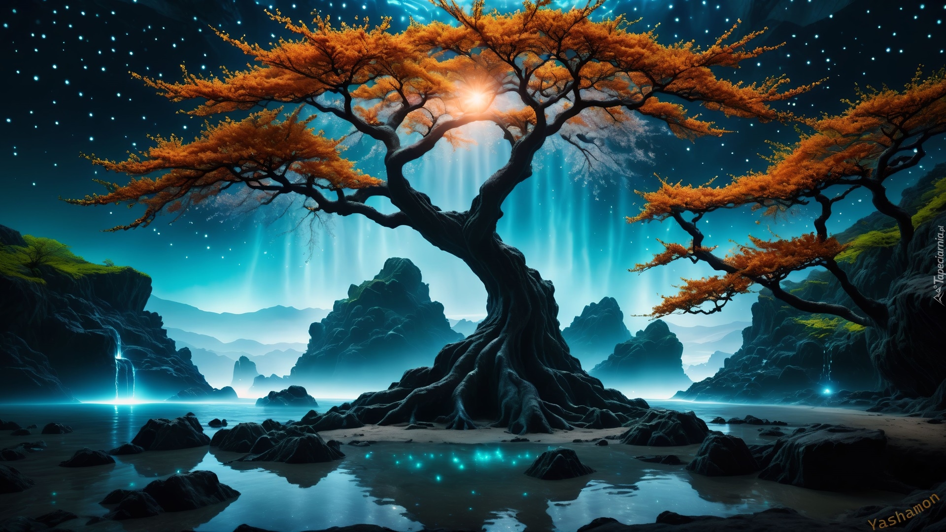 Edytor tapety: Rozgwieżdżone niebo nad pożółkłymi drzewami i skałami