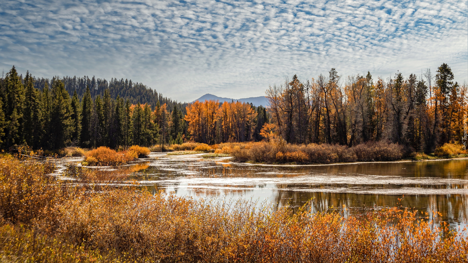 Edytor tapety: Pożółkłe drzewa i szuwary nad jeziorem