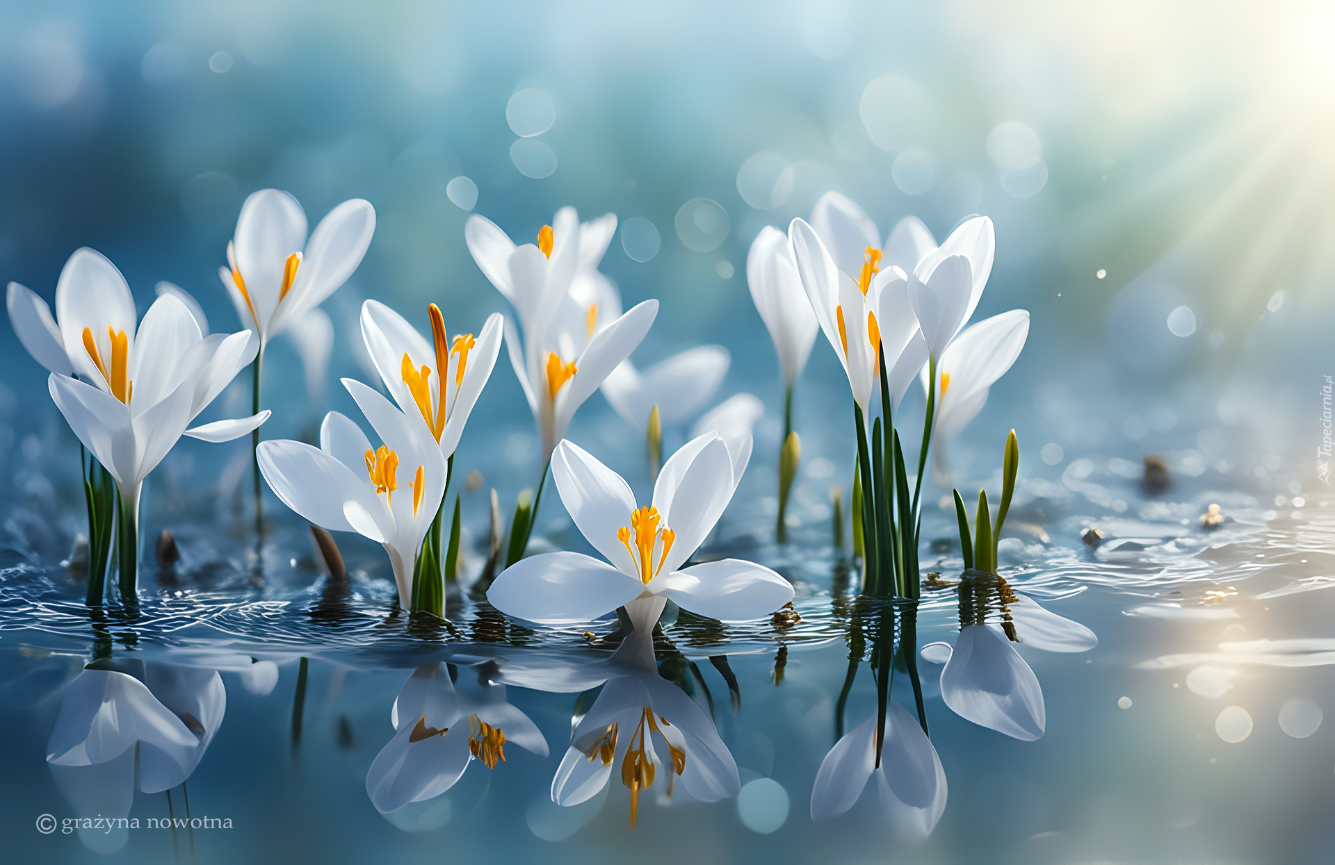Edytor tapety: Białe krokusy i ich odbicie w wodzie