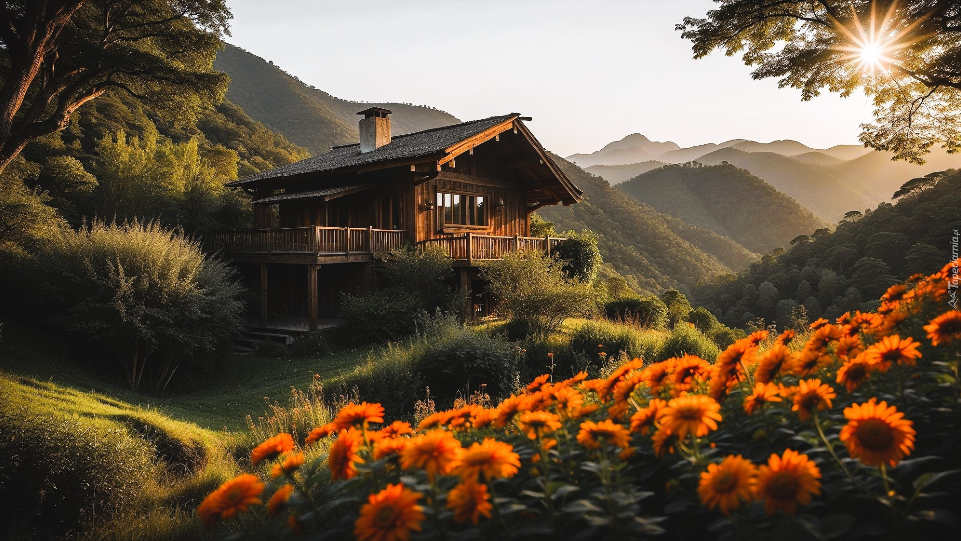Edytor tapety: Kwiatowa łąka i domek na wzgórzu