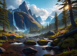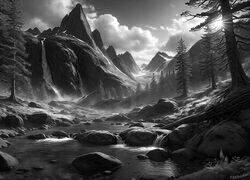 Edytor tapety: Kamienie w górskiej rzece i wodospad na skale