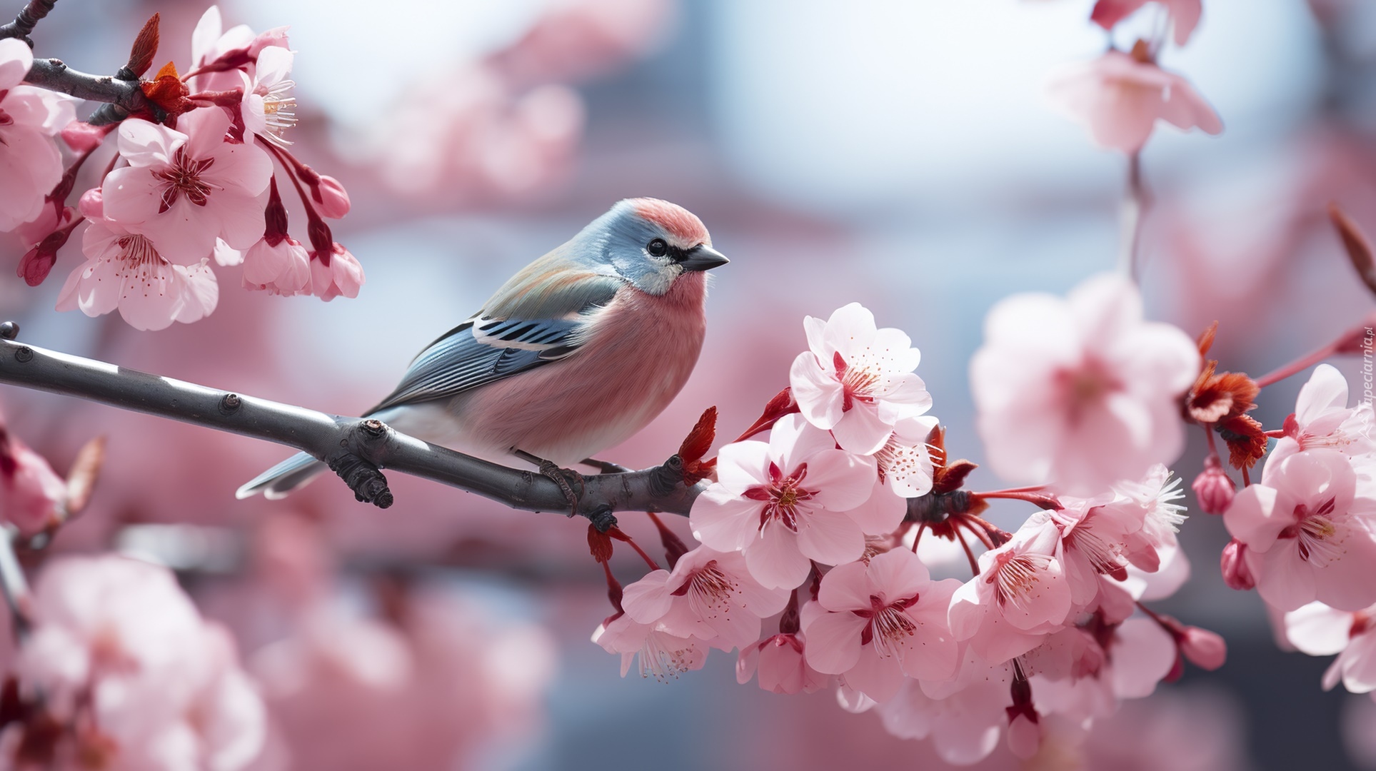 Edytor tapety: Kolorowy ptak na gałązce z różowymi kwiatami