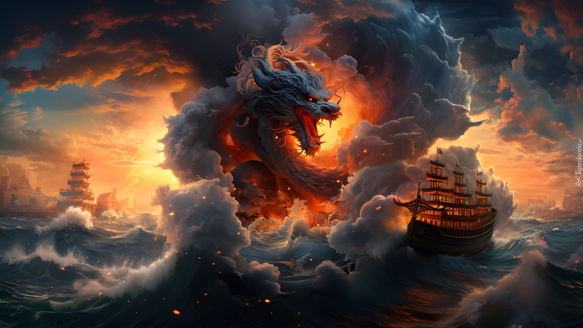 Edytor tapety: Smok i żaglowiec na wzburzonym morzu