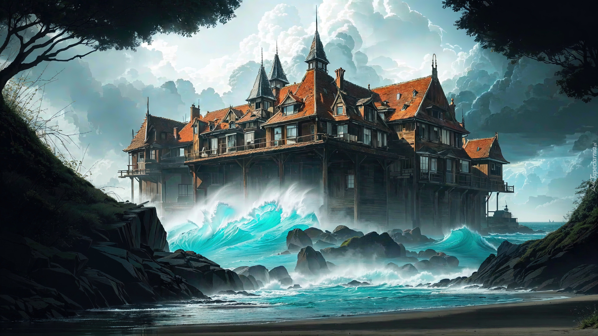 Edytor tapety: Fale rozbijające się o dom nad morzem