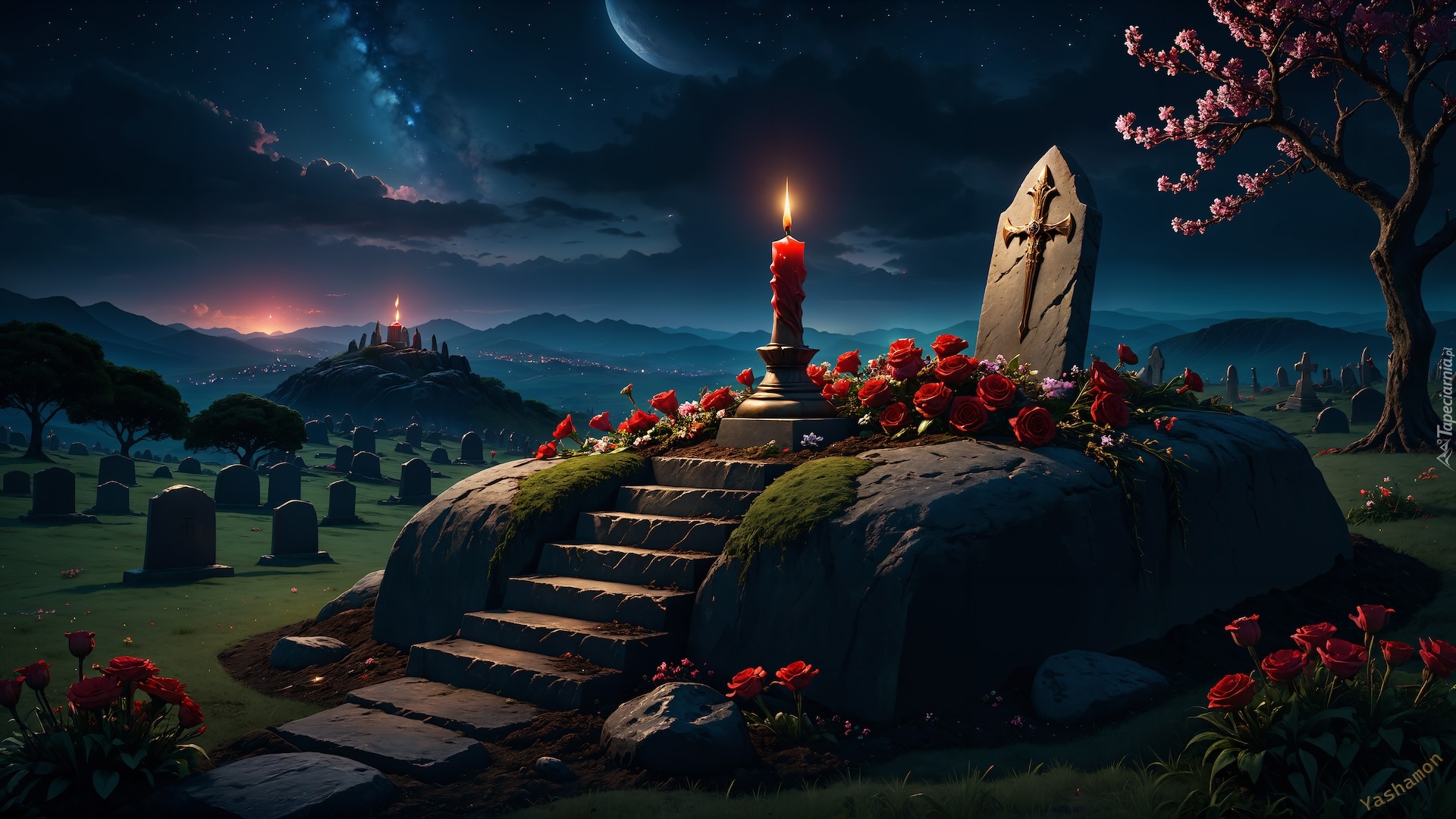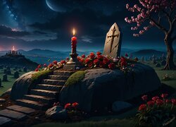 Edytor tapety: Kwiaty i zapalona świeca na nagrobku