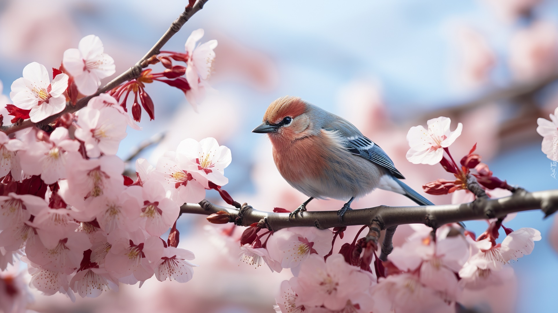 Edytor tapety: Ptak na gałązce z różowymi kwiatkami