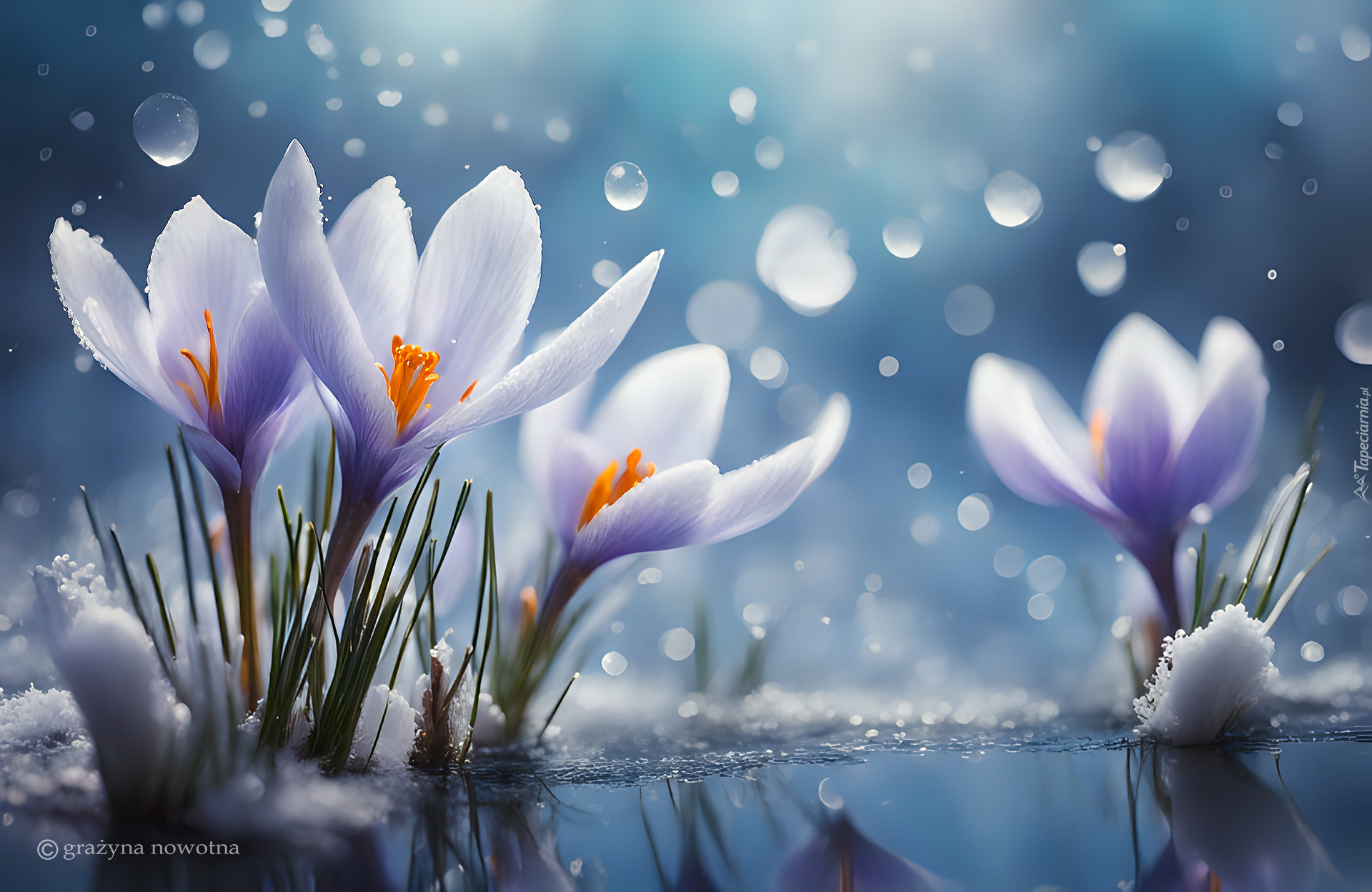 Edytor tapety: Krople i jasnofioletowe krokusy w śniegu