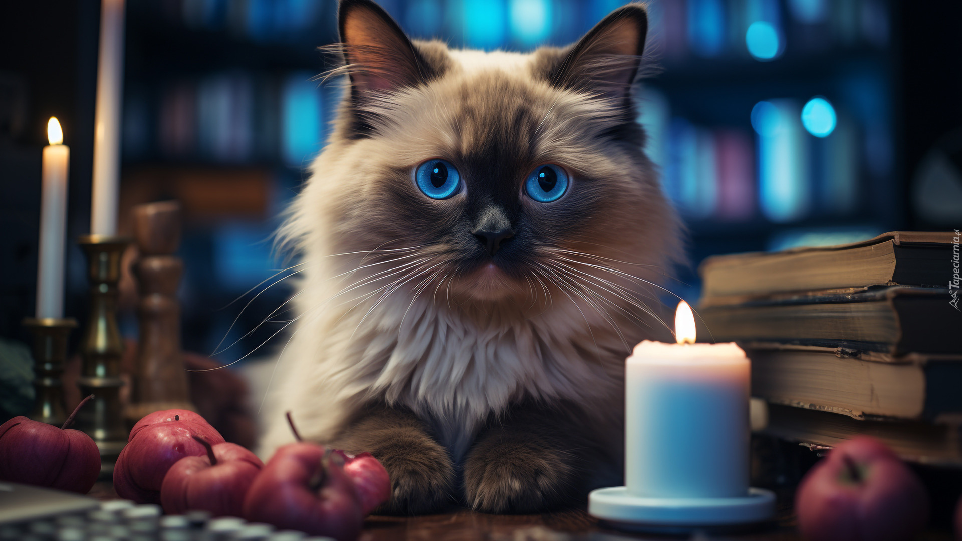 Edytor tapety: Kot obok książek i świec
