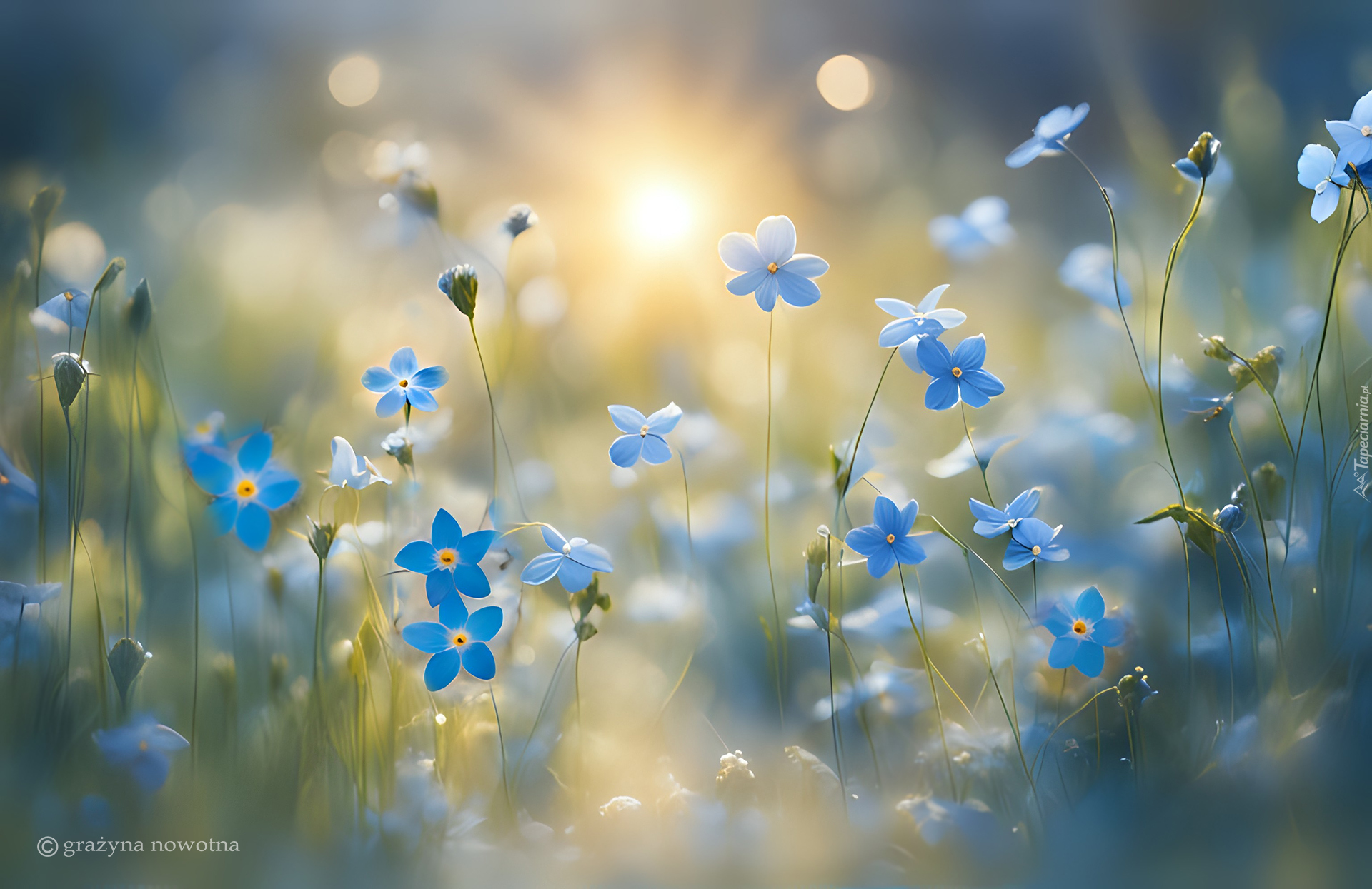 Edytor tapety: Niebieskie niezapominajki na rozmytym słonecznym tle