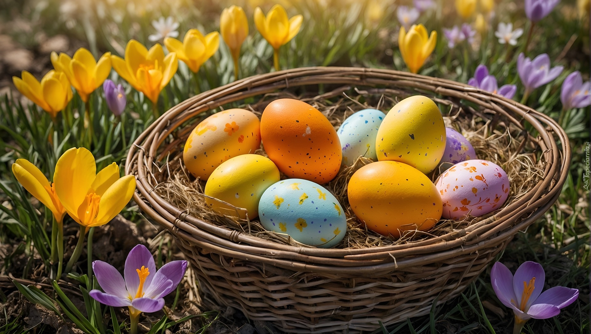 Edytor tapety: Pisanki w koszyczku otoczonym krokusami