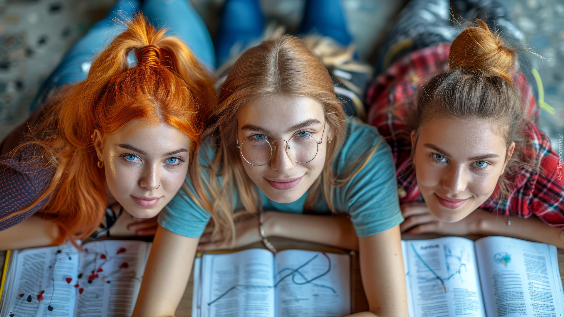 Edytor tapety: Trzy leżące dziewczyny nad książkami