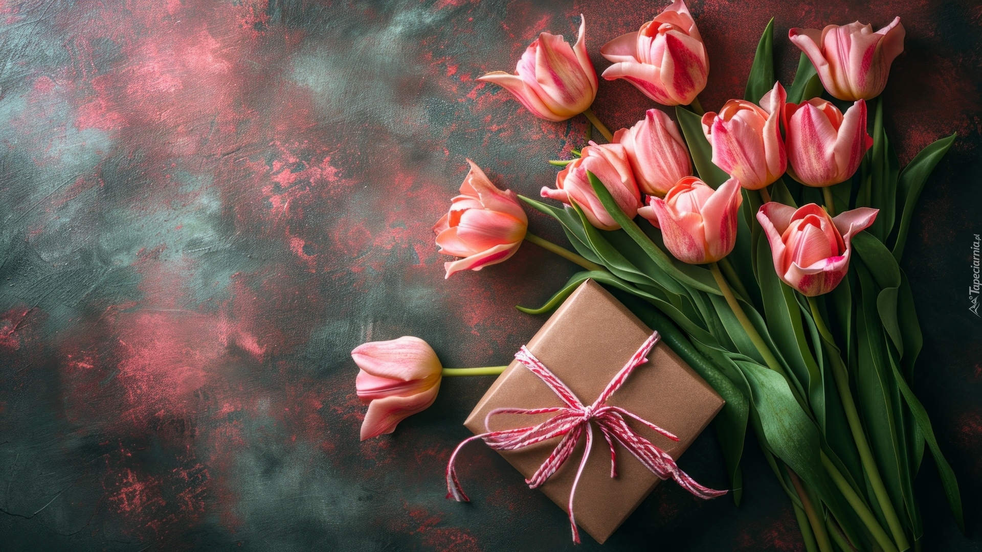 Edytor tapety: Pudełko z prezentem obok różowych tulipanów