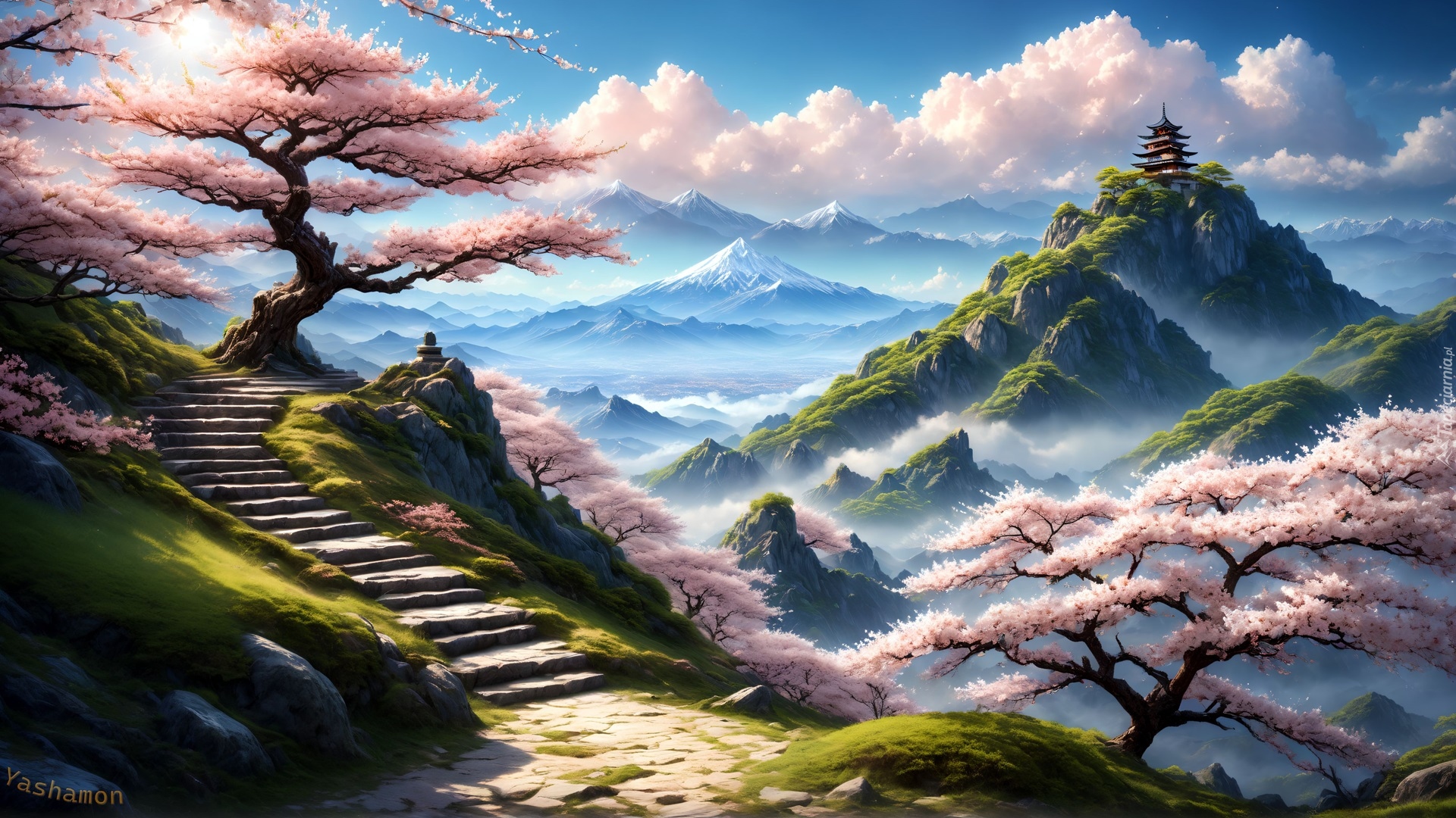 Edytor tapety: Różowe drzewa przy schodach na tle gór