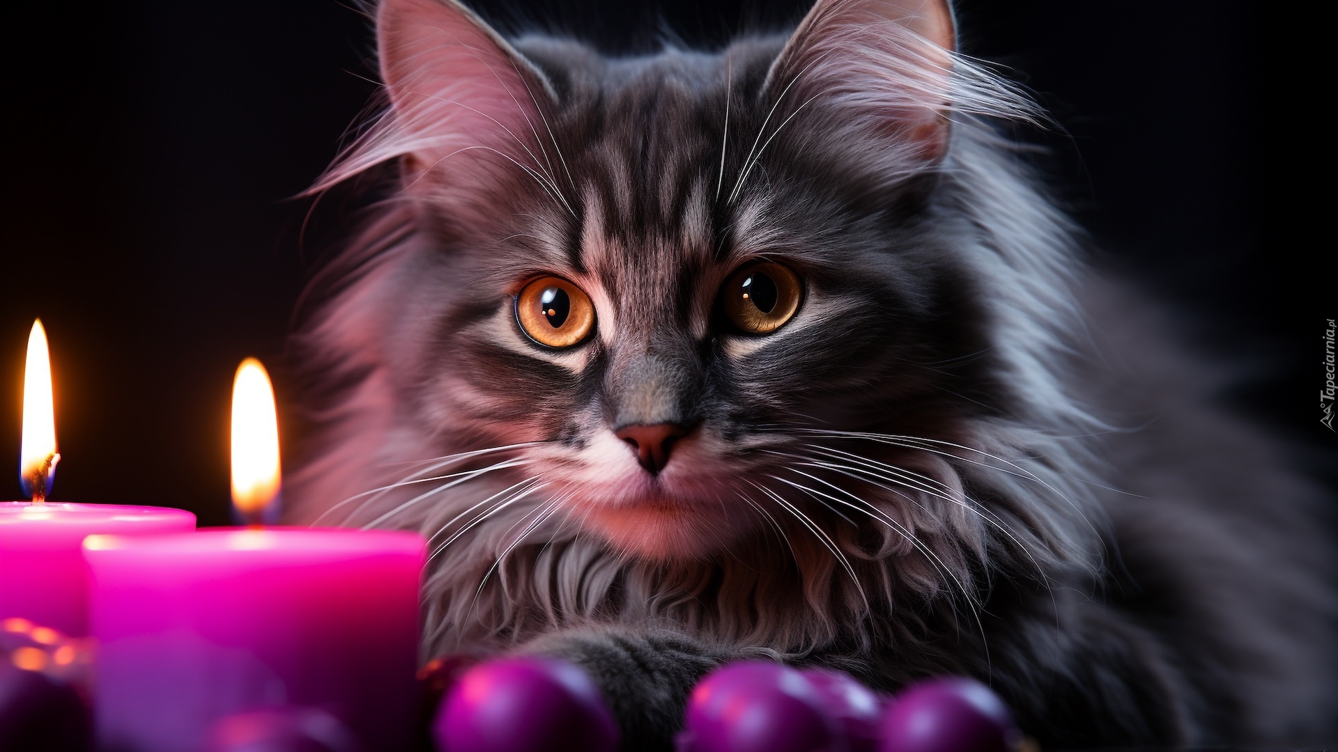 Edytor tapety: Puszysty kot obok zapalonych fioletowych świec