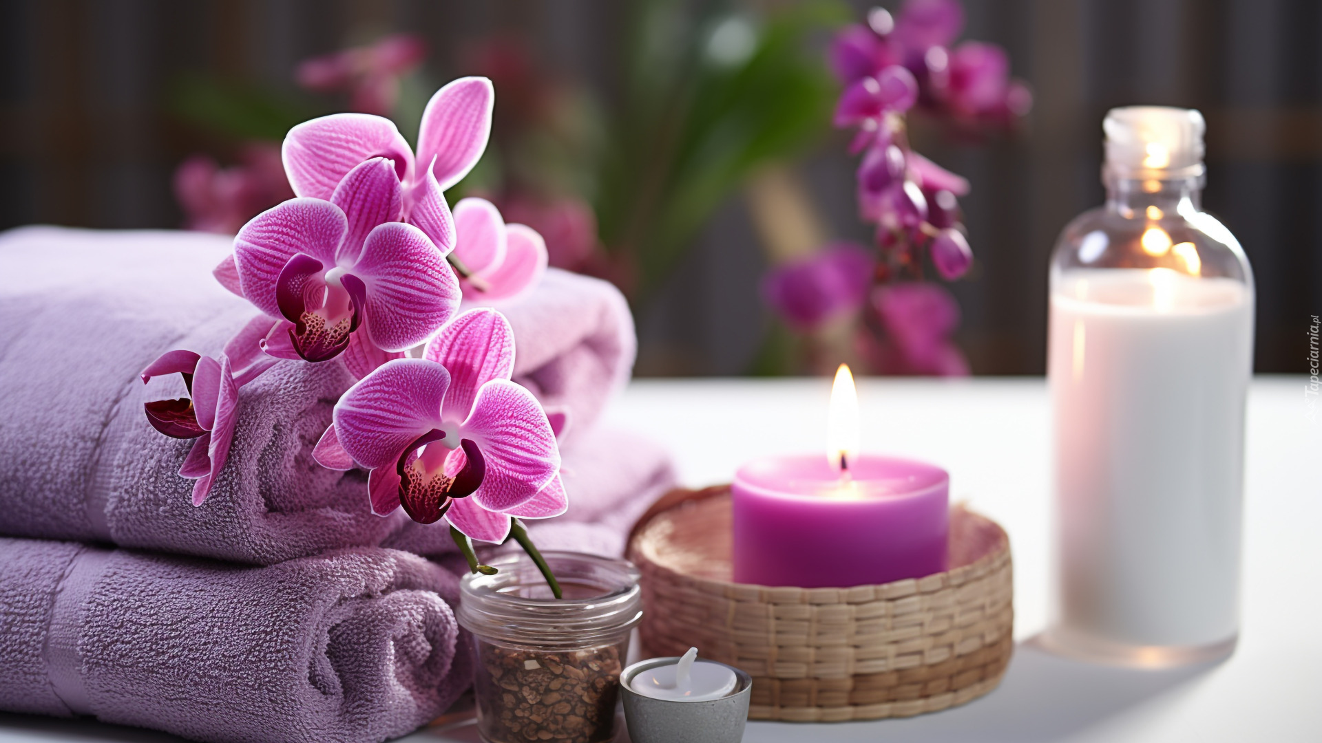 Edytor tapety: Fioletowe storczyki na ręcznikach obok świecy