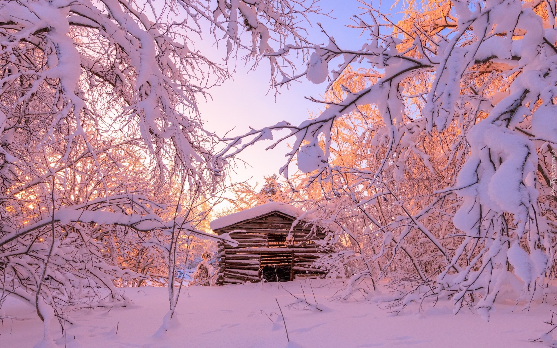 Edytor tapety: Szopa pod ośnieżonymi drzewami