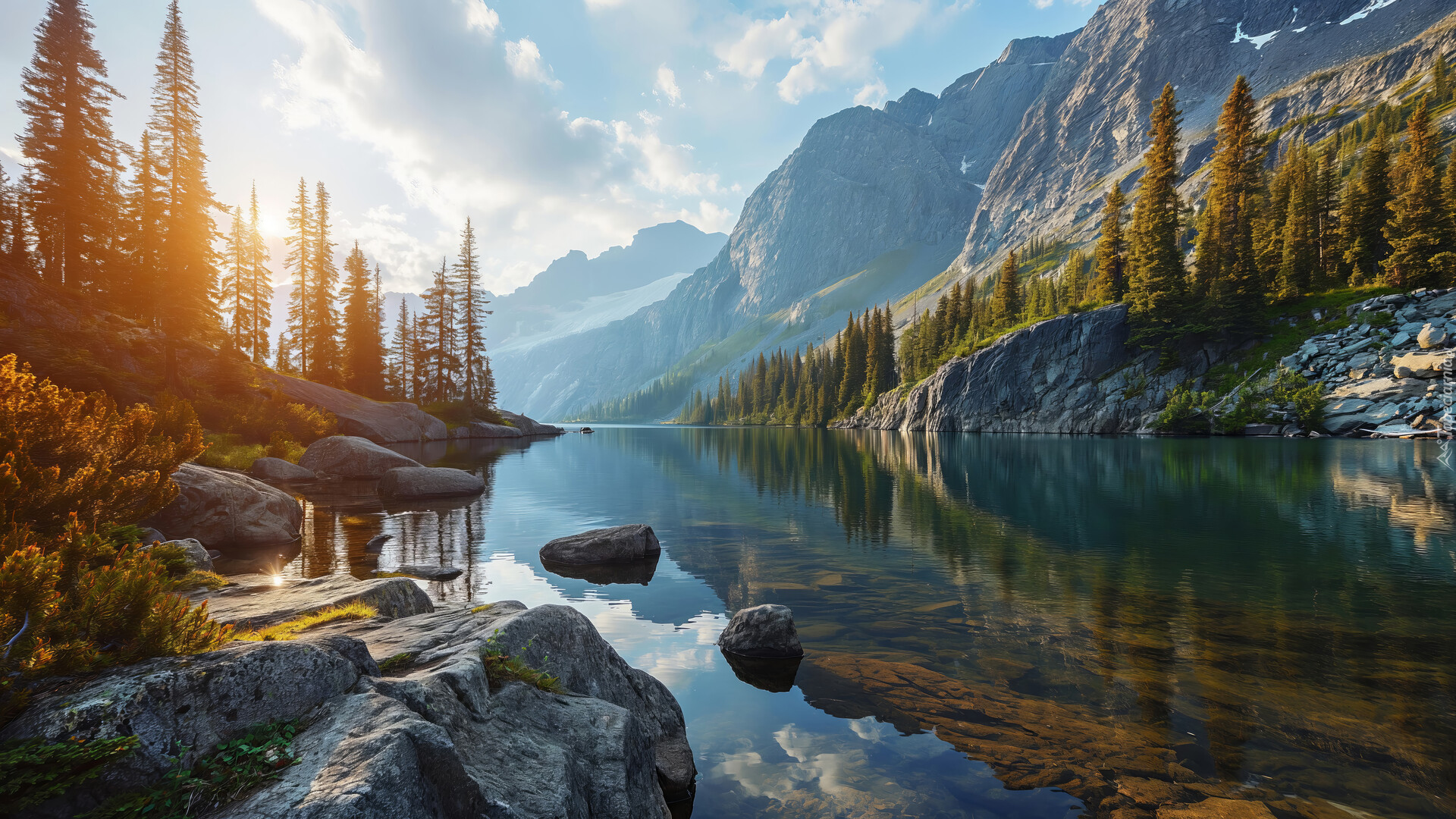 Edytor tapety: Drzewa iglaste na skałach nad górskim jeziorem