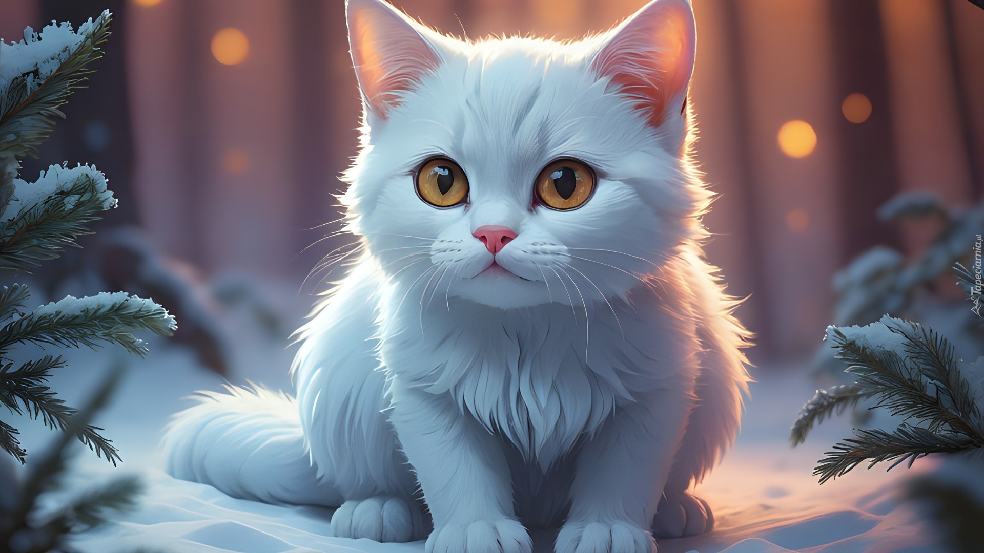 Edytor tapety: Biały kot na śniegu i ośnieżone gałązki
