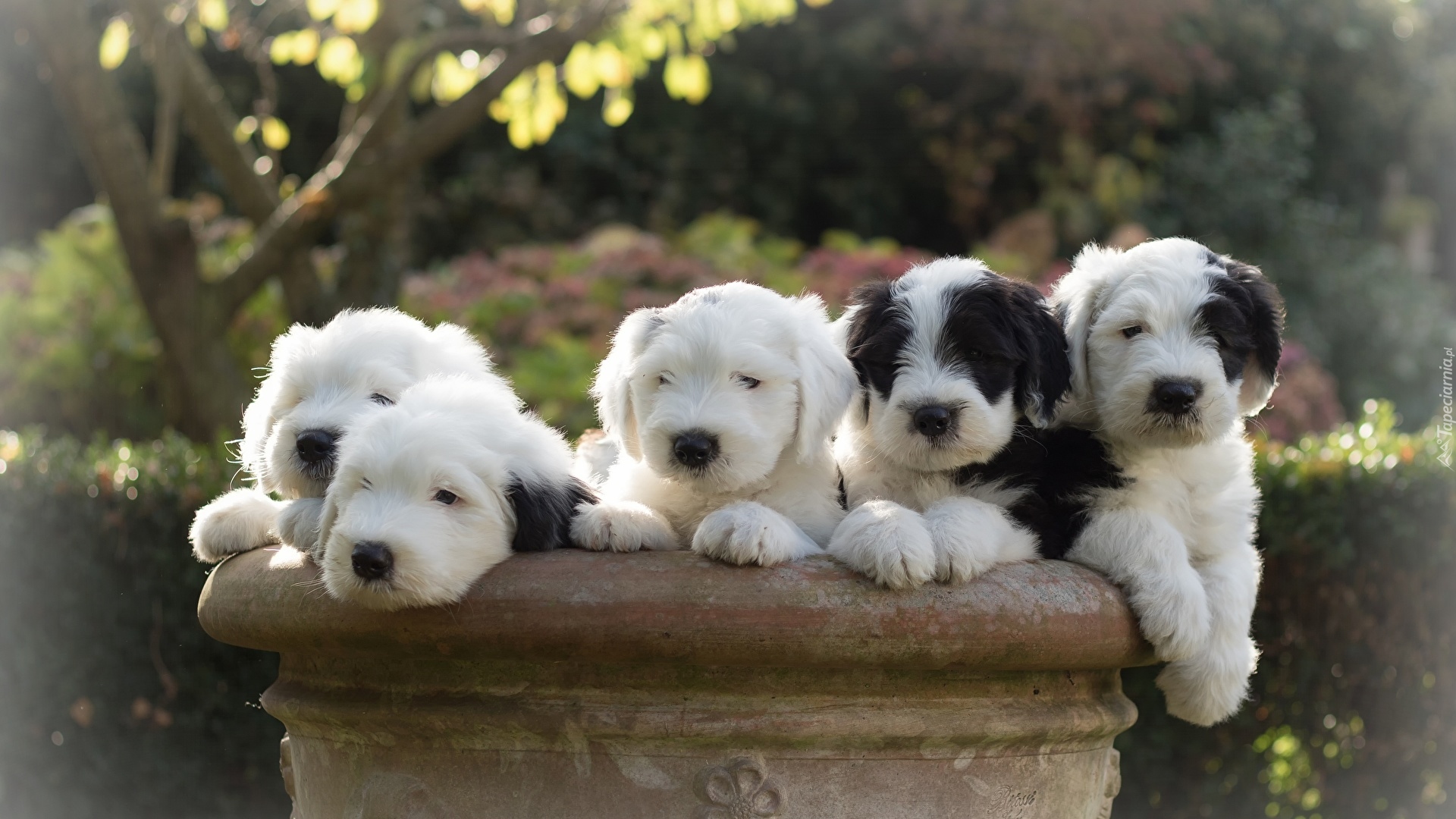 Edytor tapety: Małe owczarki staroangielskie Bobtail w kamiennej donicy