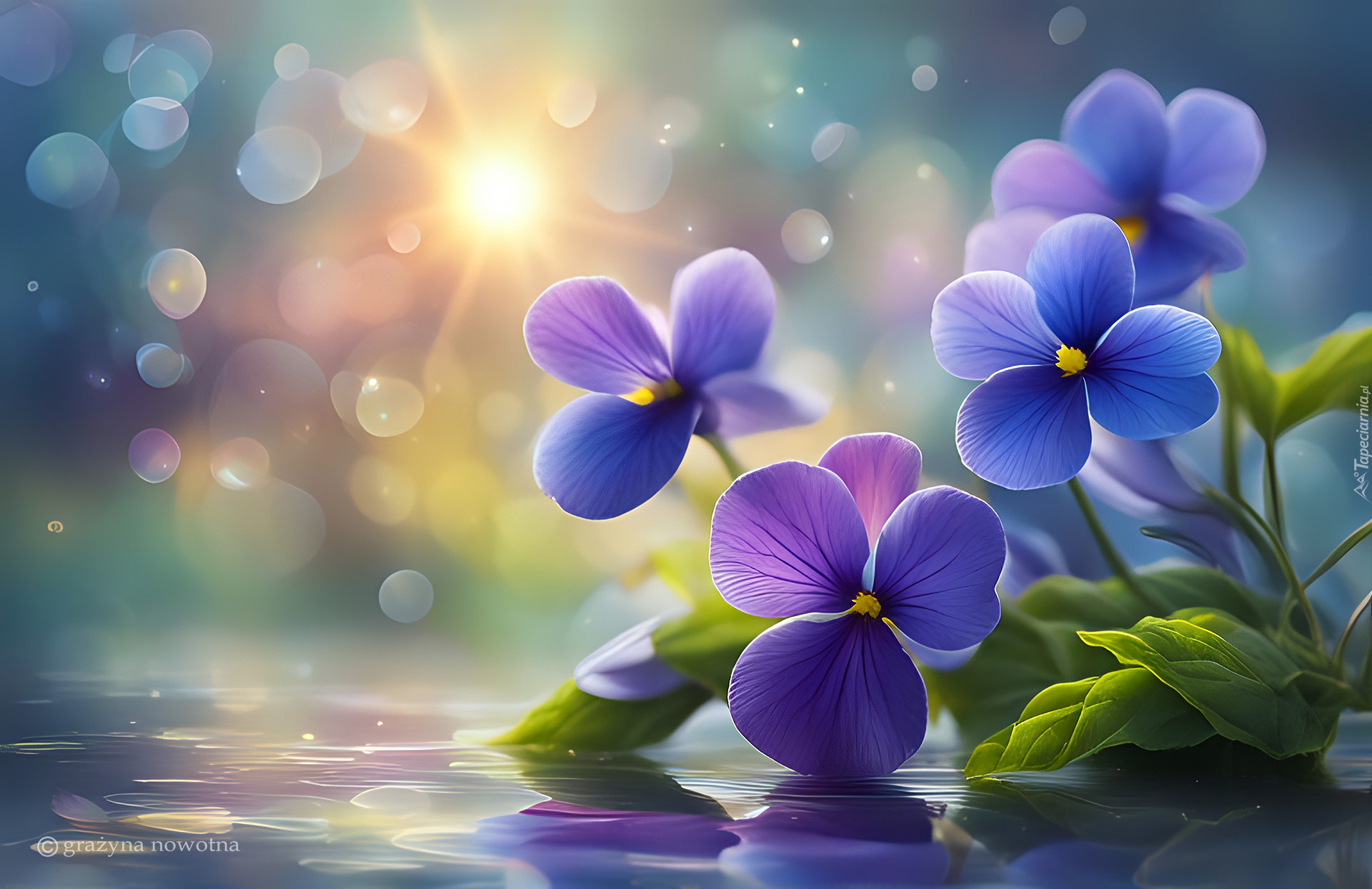 Edytor tapety: Fioletowe i niebieskie kwiaty i liście w wodzie