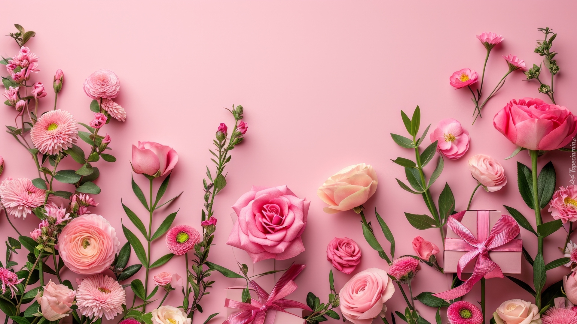 Edytor tapety: Prezencik i różne kwiaty na różowym tle