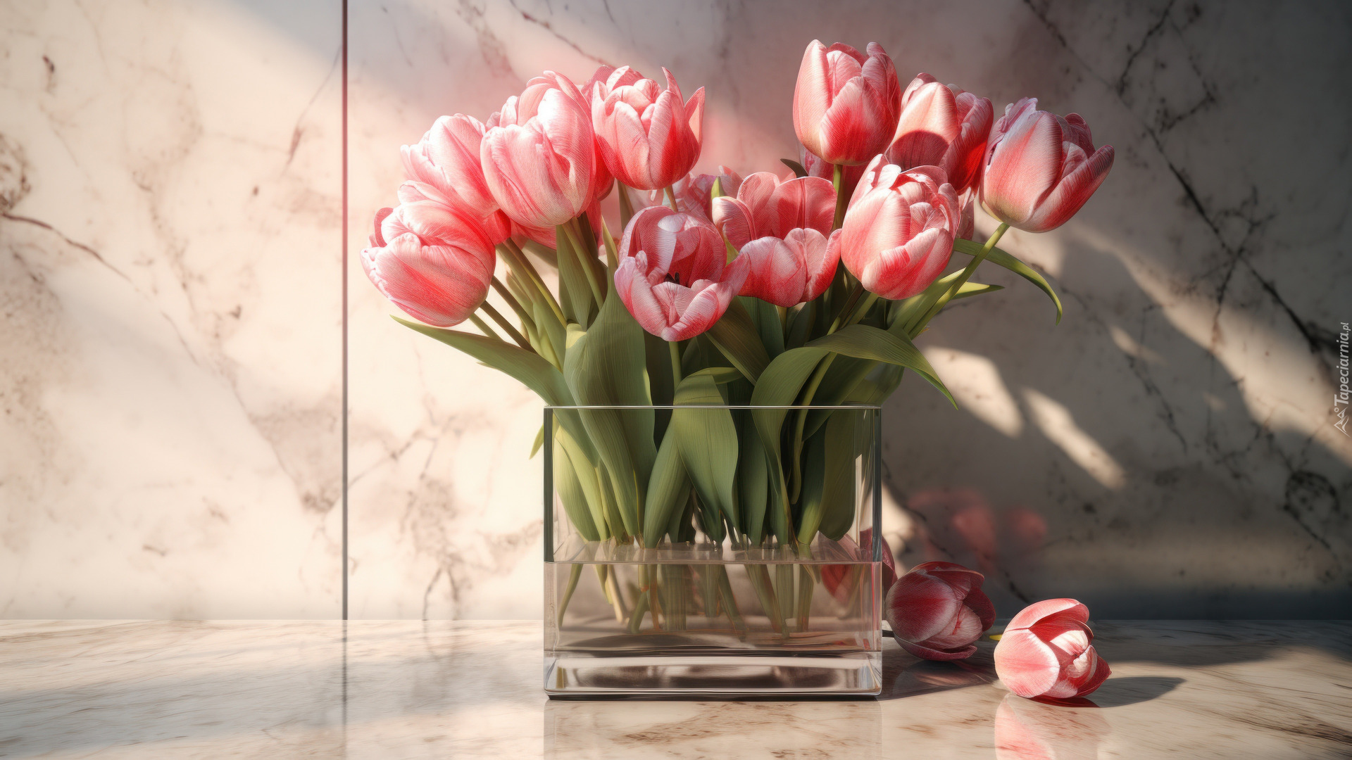 Edytor tapety: Pęk różowych tulipanów w szklanym wazonie