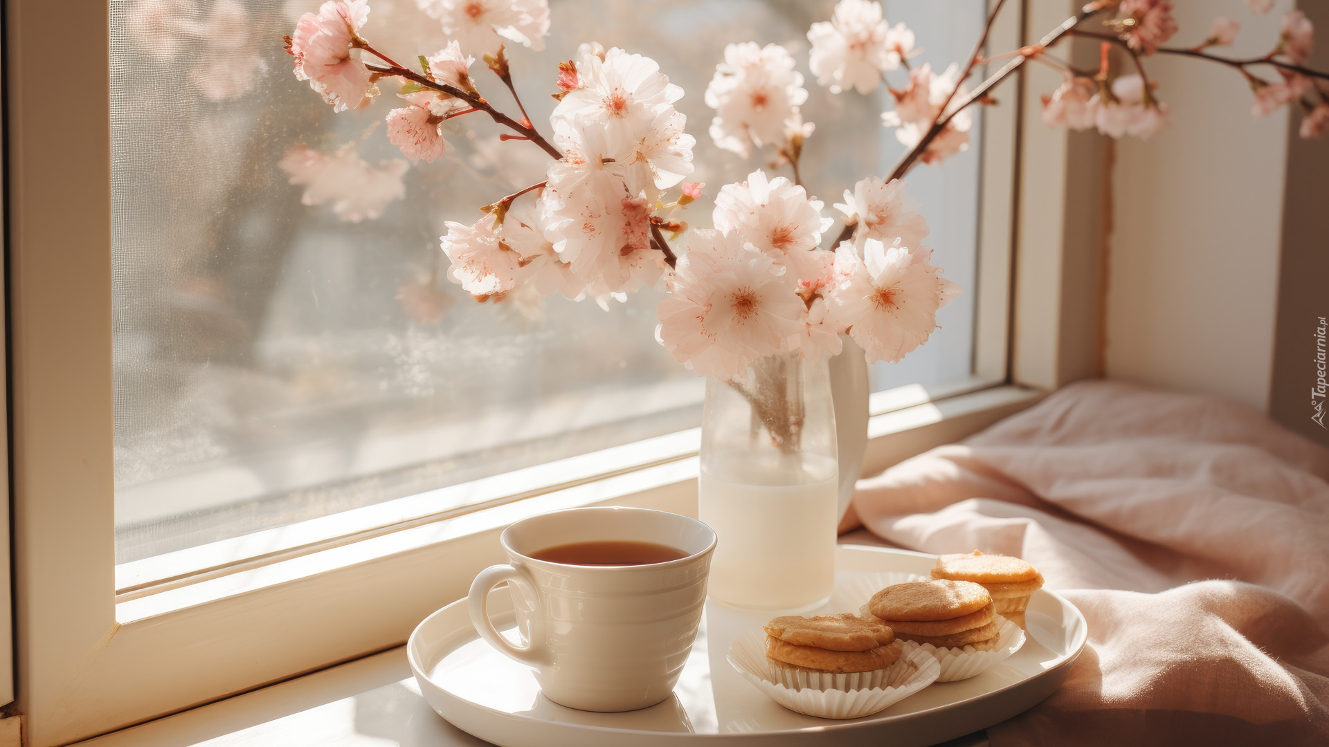 Edytor tapety: Kwitnące gałązki w wazonie obok filiżanki i ciastek