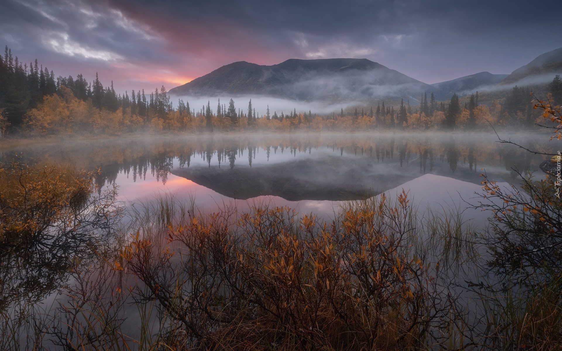 Edytor tapety: Zamglone góry i lasy nad jeziorem