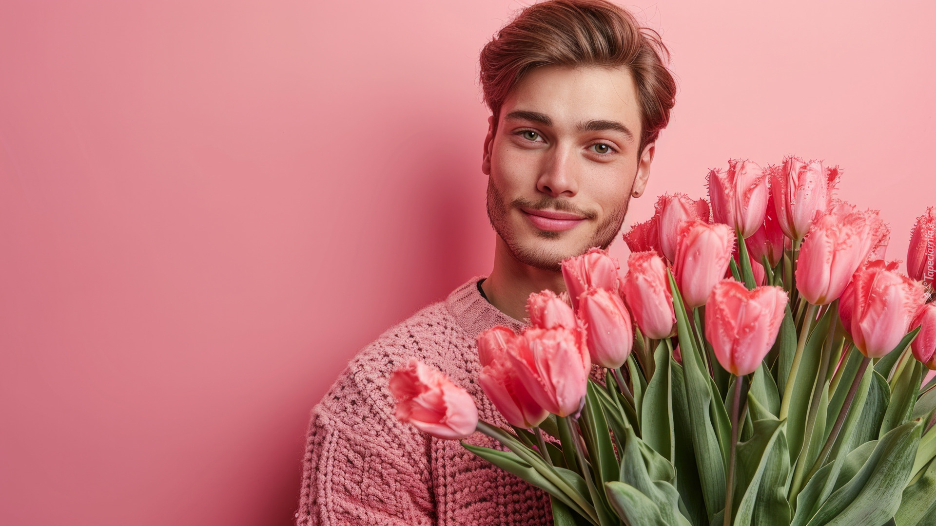 Edytor tapety: Mężczyzna z bukietem różowych tulipanów