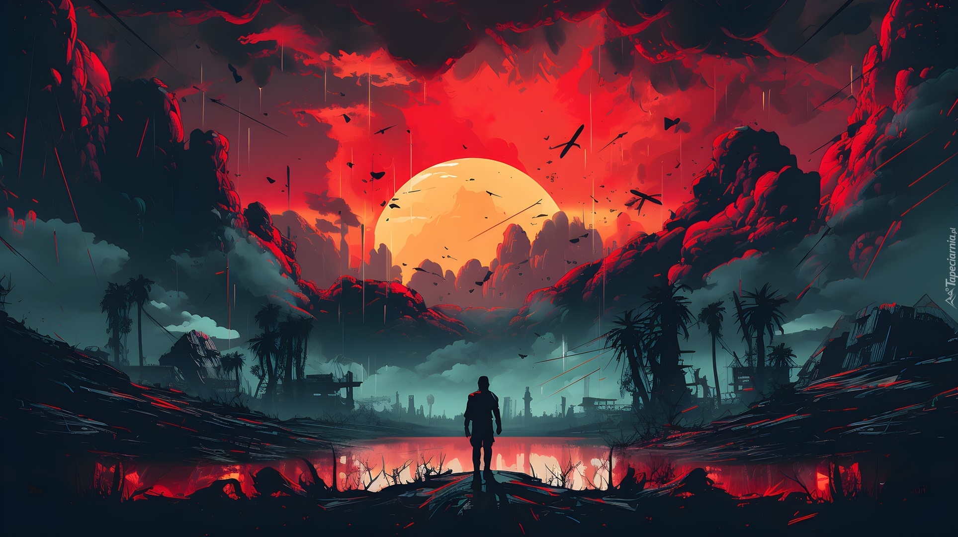Edytor tapety: Mężczyzna nad wodą na tle zachodzącego słońca