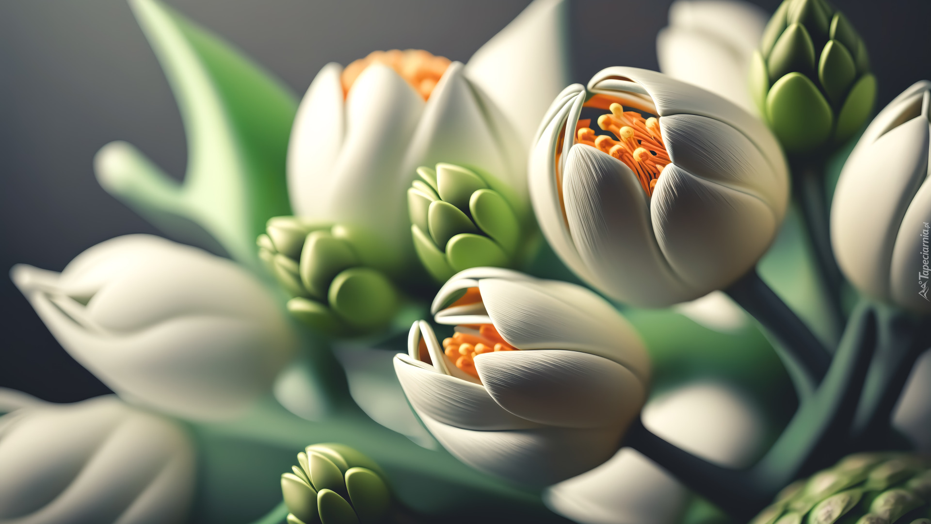 Edytor tapety: Pąki rozkwitających białych tulipanów w grafice