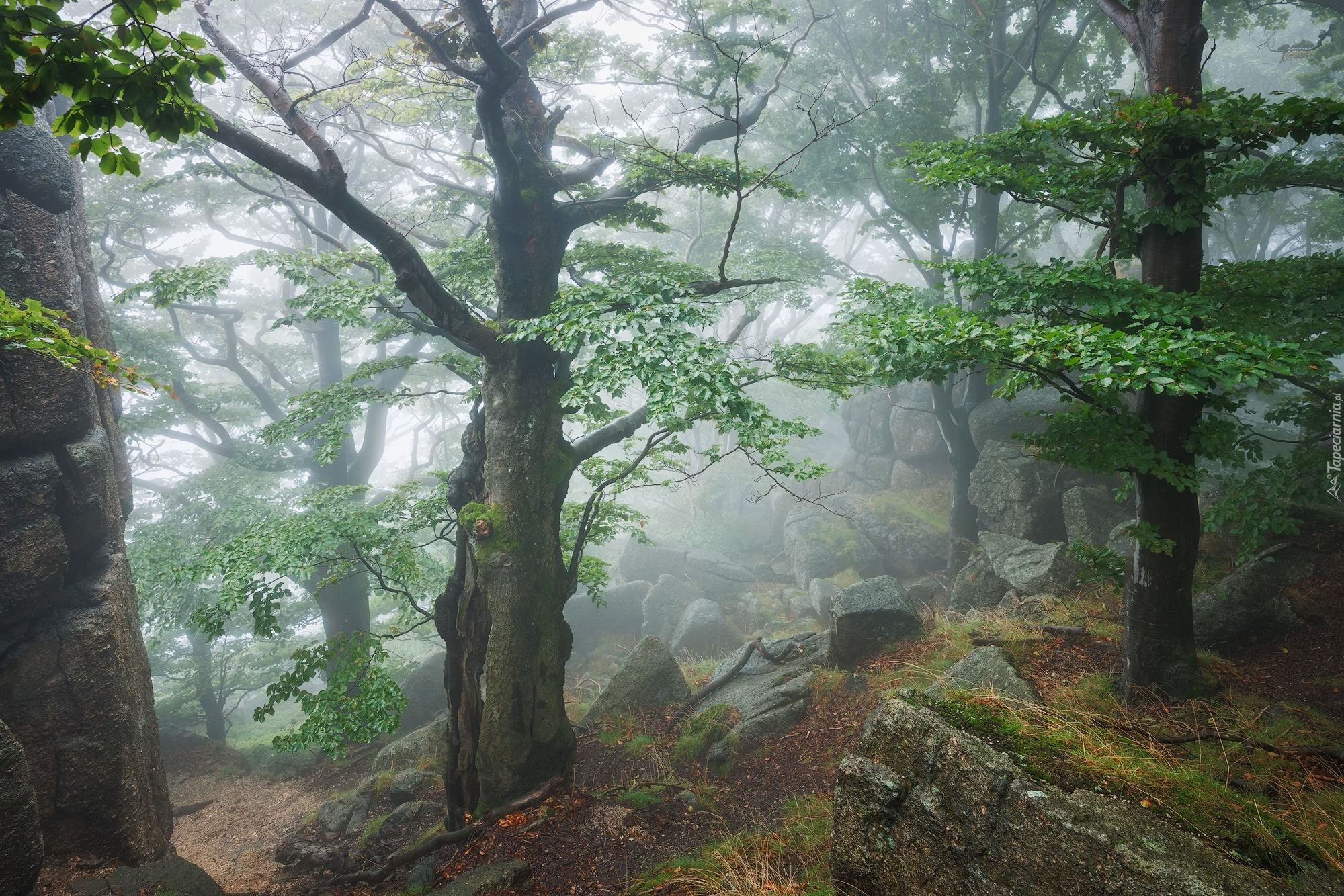 Edytor tapety: Zielone drzewa i głazy w zamglonym lesie