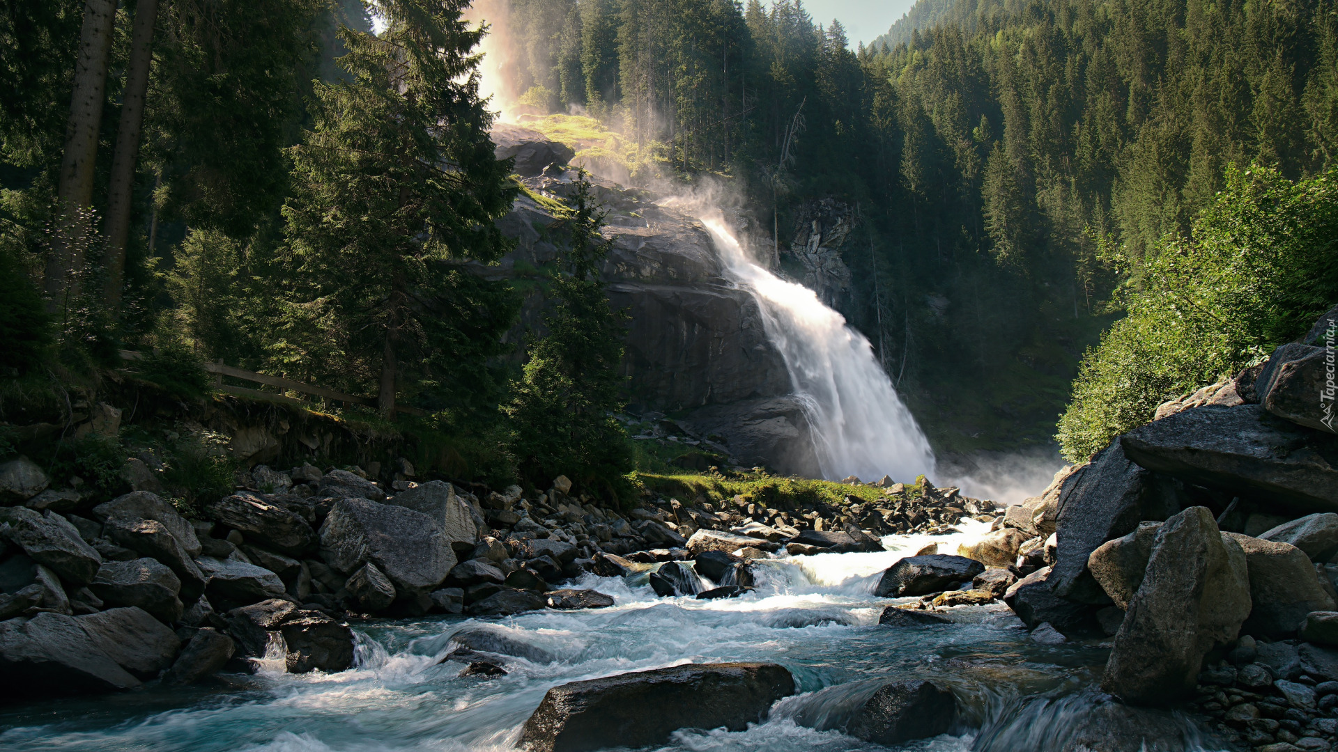 Edytor tapety: Kamienista rzeka i wodospad na skale