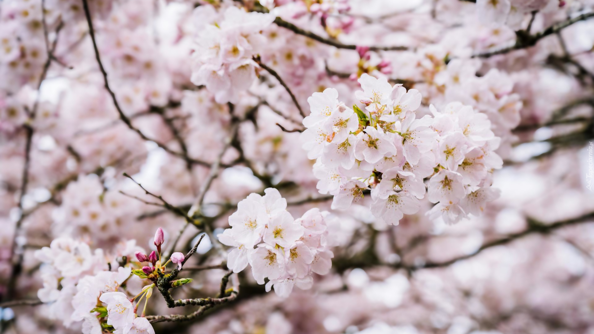 Edytor tapety: Okwiecone gałązki na drzewie owocowym
