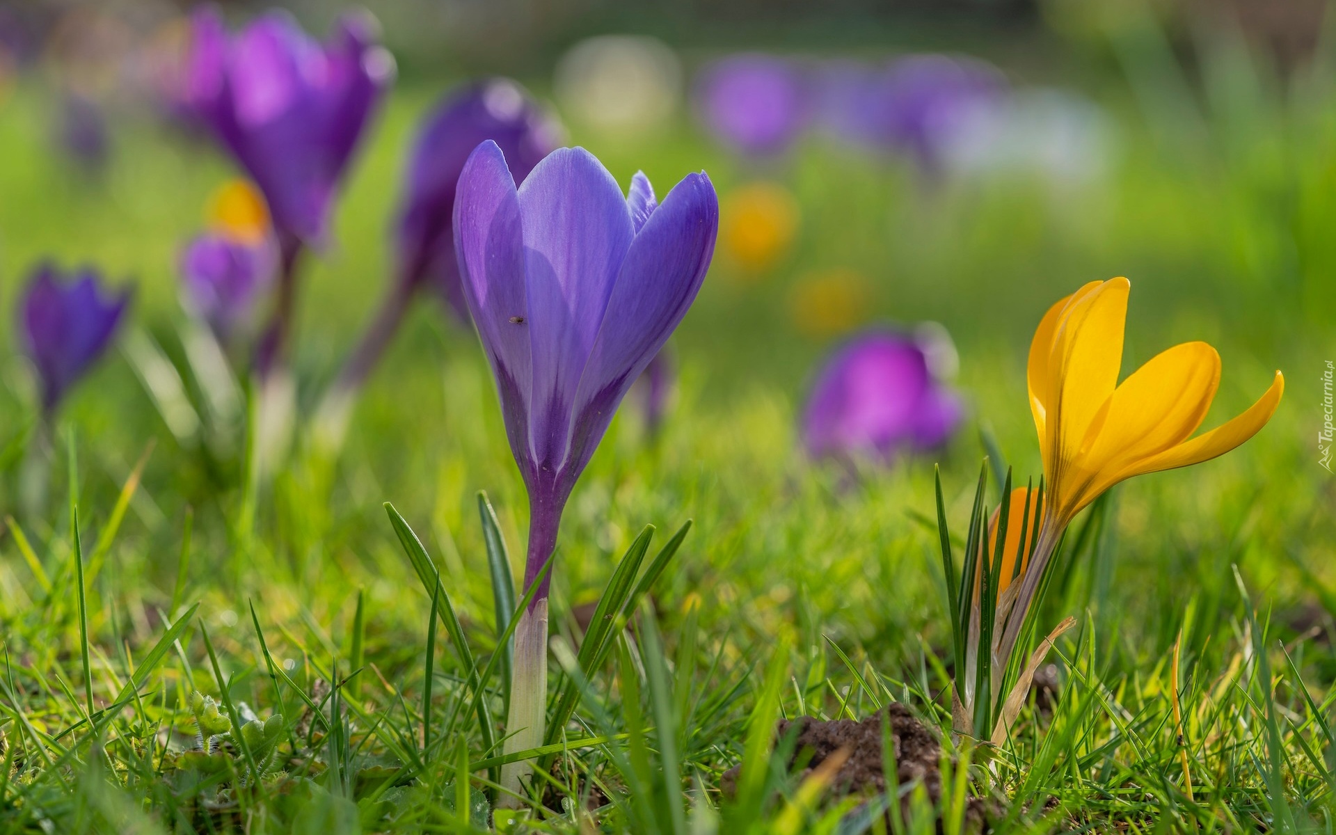 Edytor tapety: Kwitnący fioletowy i żółty krokus w trawie