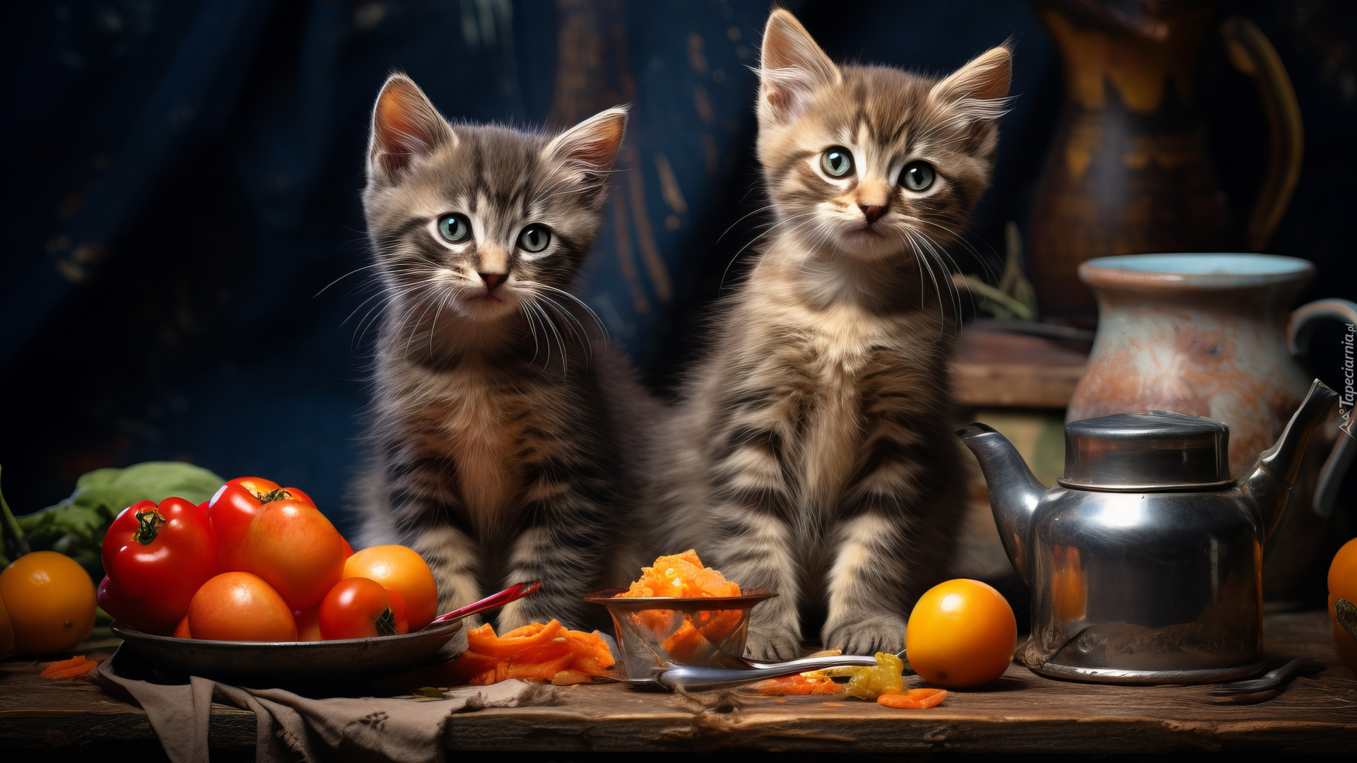 Edytor tapety: Dwa małe kotki obok dzbanka i pomidorów