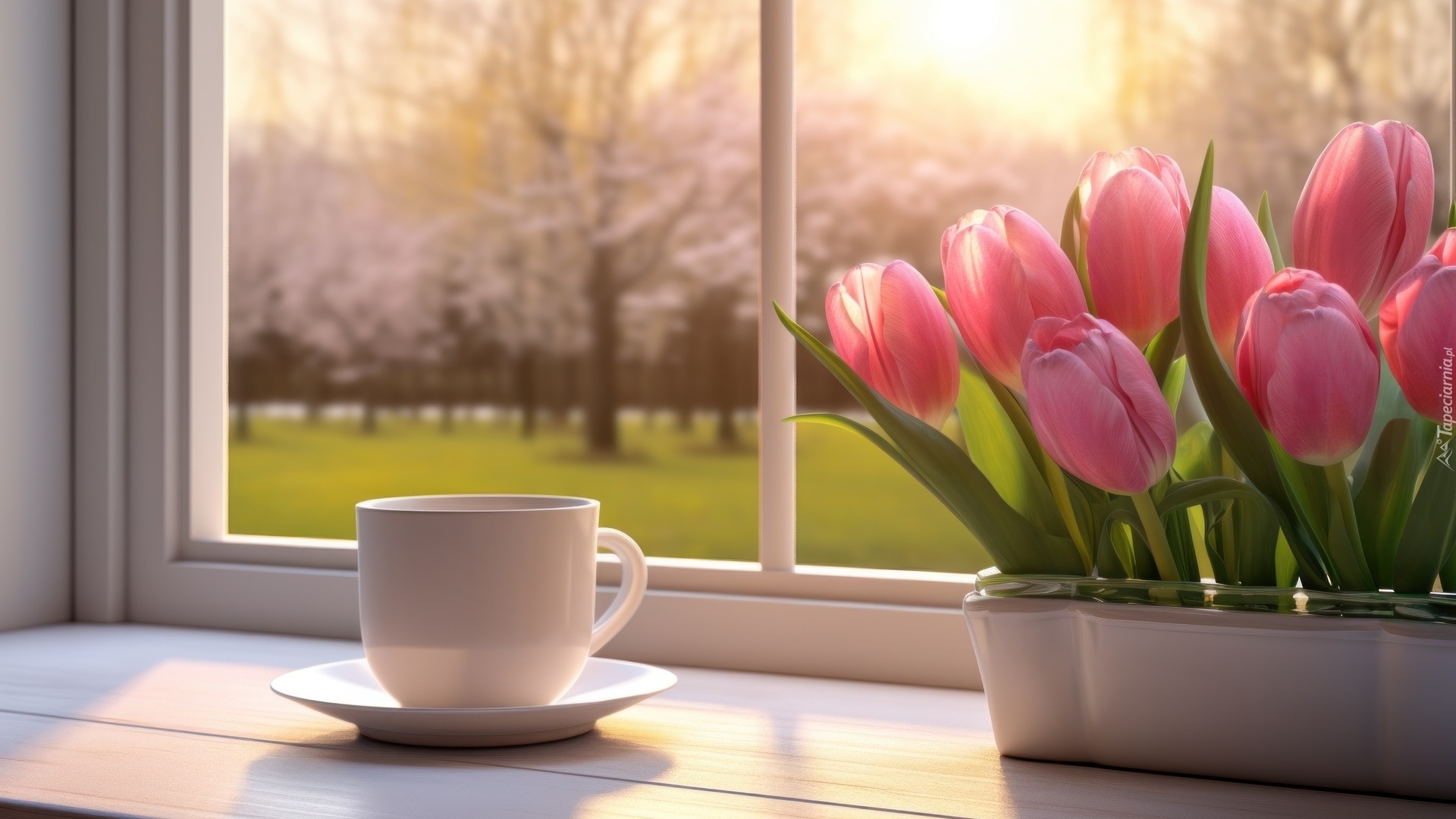 Edytor tapety: Filiżanka obok tulipanów w doniczce na parapecie