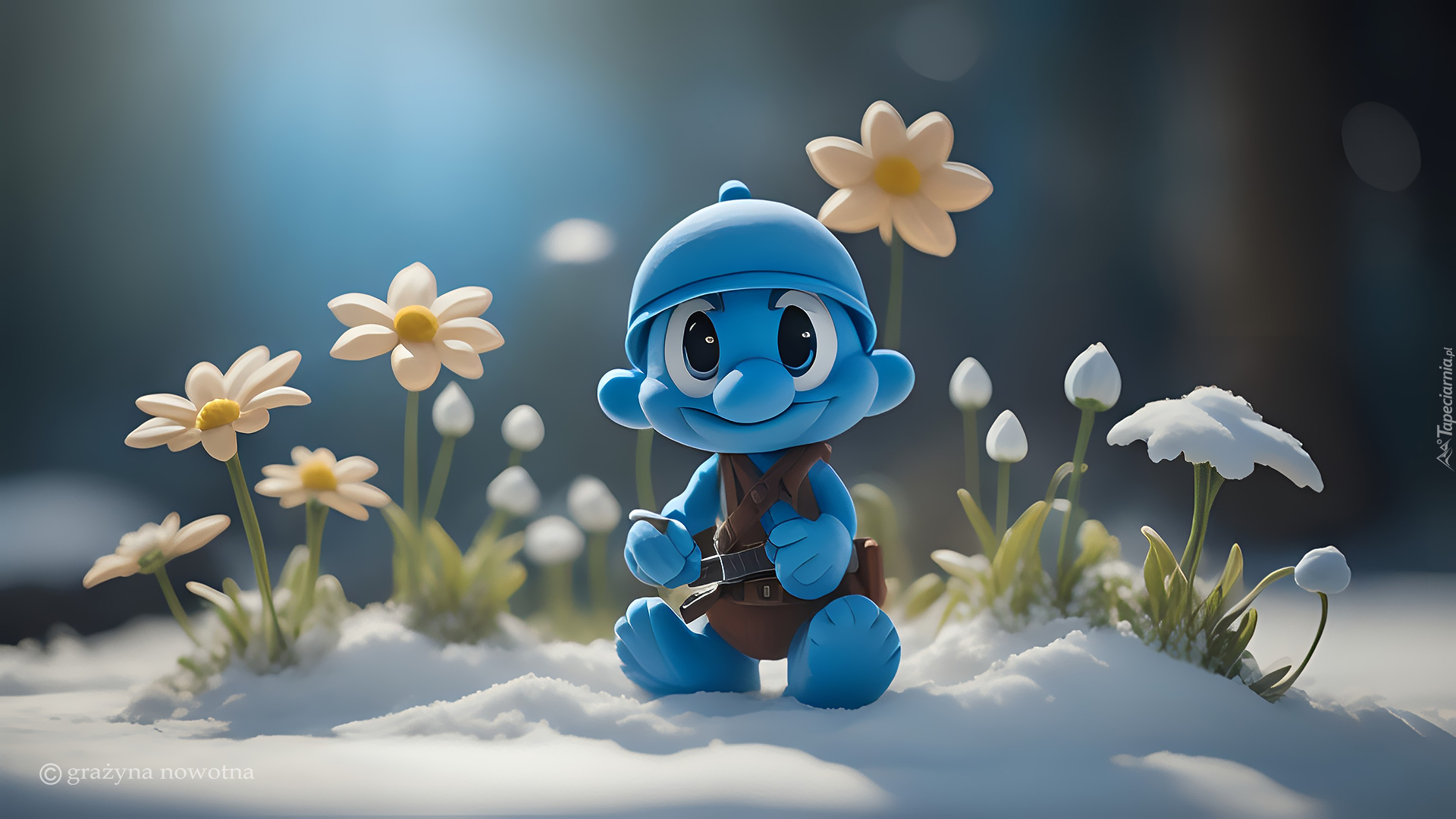 Edytor tapety: Smerf na śniegu wśród kwiatków