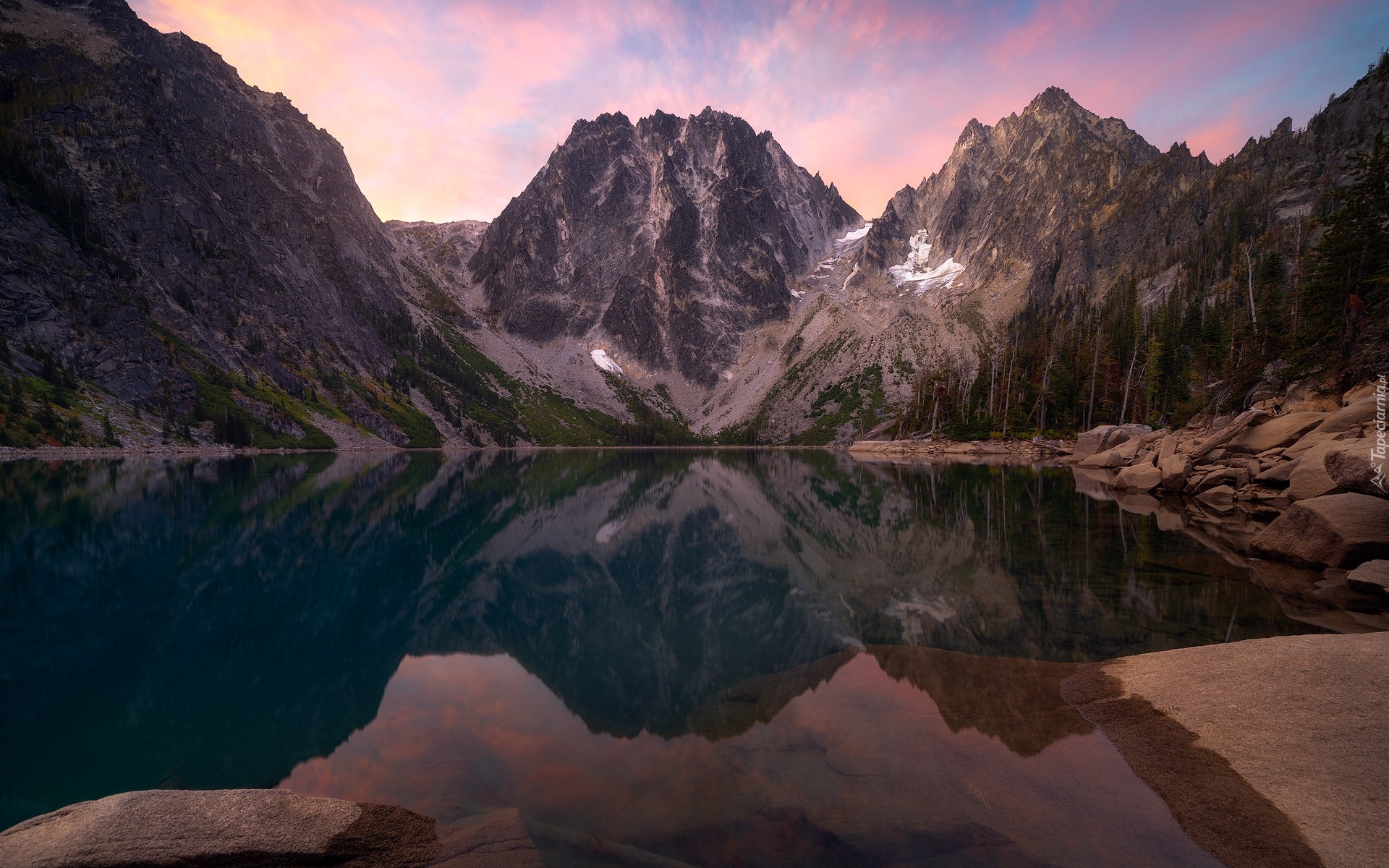 Edytor tapety: Odbicie szczytów w górskim jeziorze