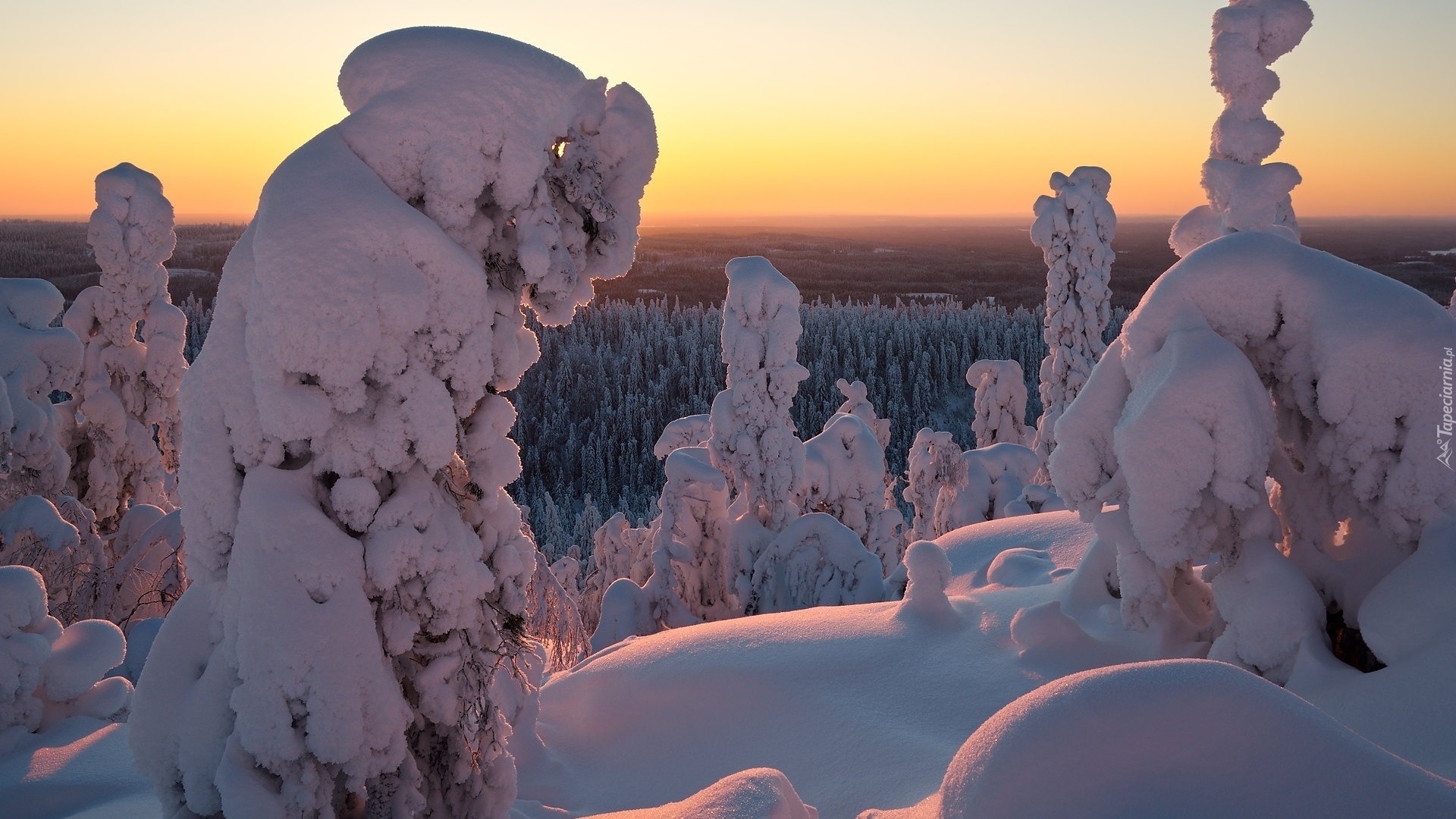 Edytor tapety: Zasypane o poranku śniegiem drzewa na tle lasu