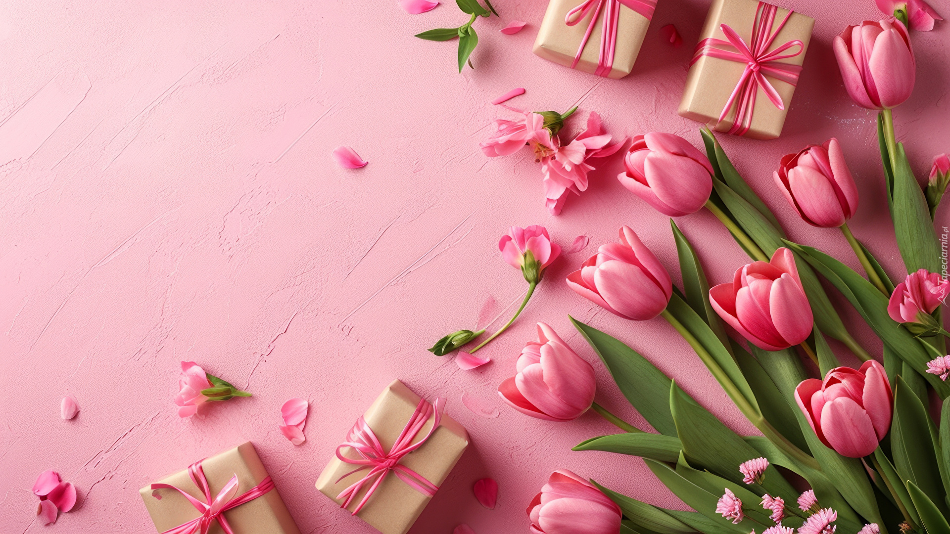 Edytor tapety: Cztery prezenty i tulipany na różowym tle
