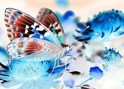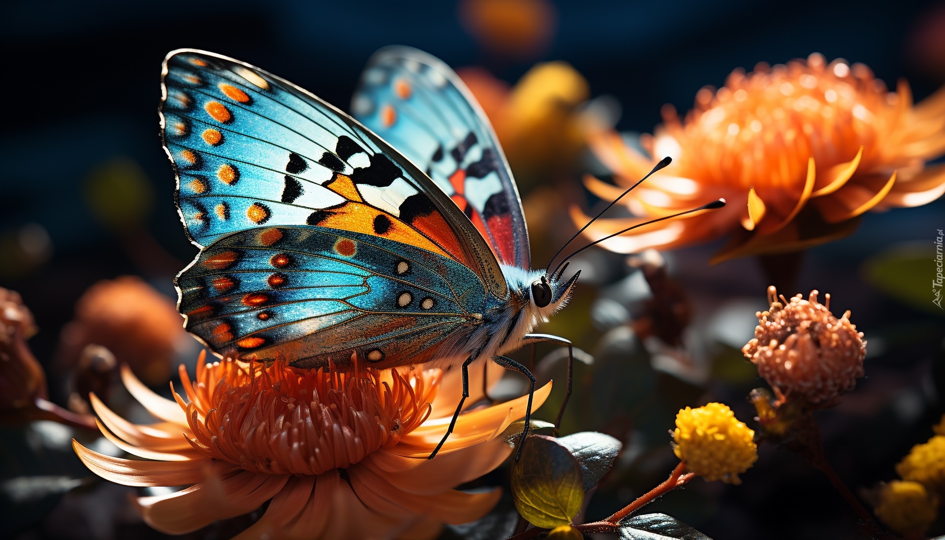 Edytor tapety: Niebieski motyl na pomarańczowym kwiatku w świetle