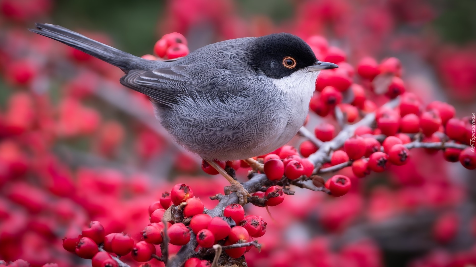Edytor tapety: Pokrzewka aksamitna na gałązce z czerwonymi owocami